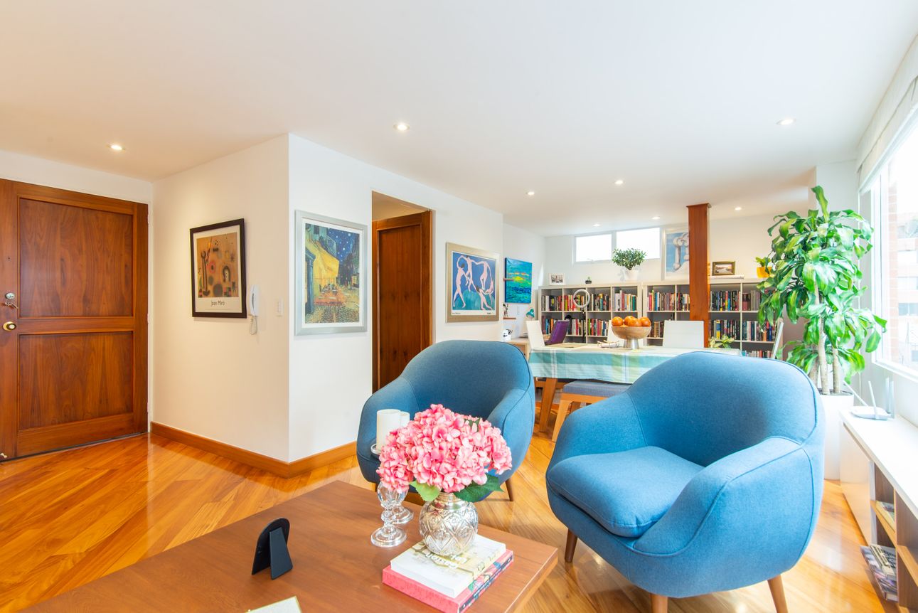 El apartamento tiene 2 espacios de parqueadero en línea. Además, está ubicado en una zona estratégica del Chicó, cerca de restaurantes, tiendas y transporte público.