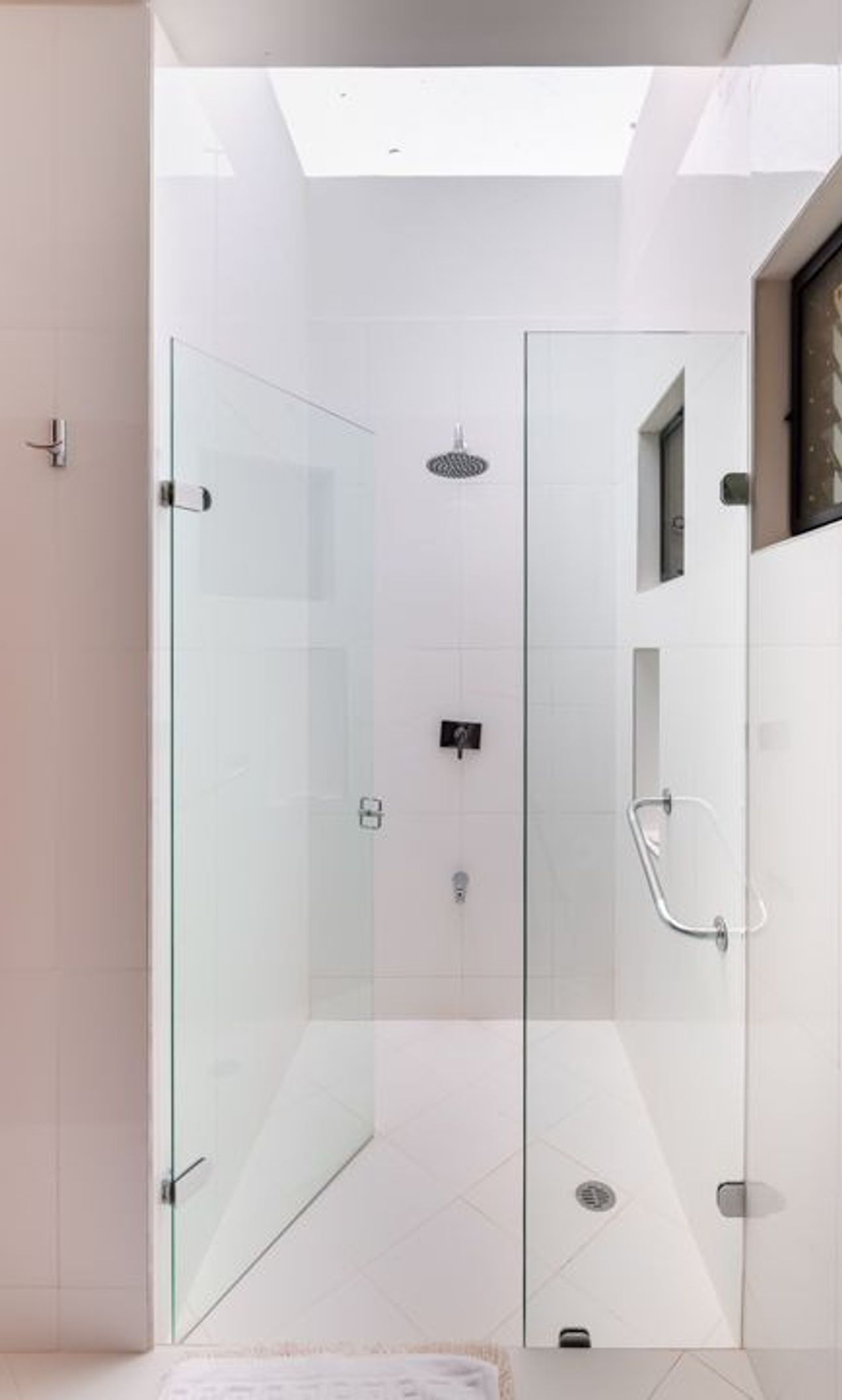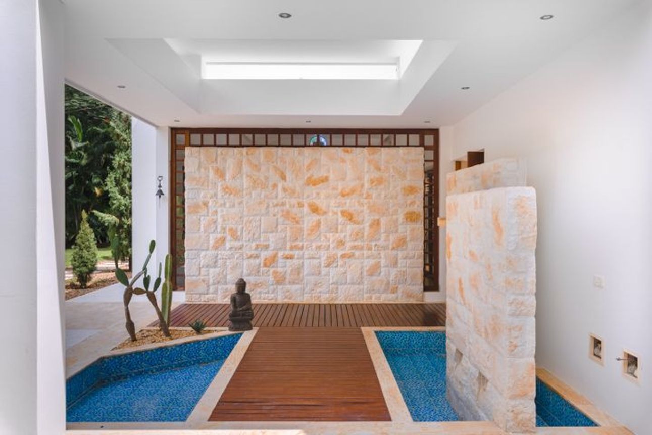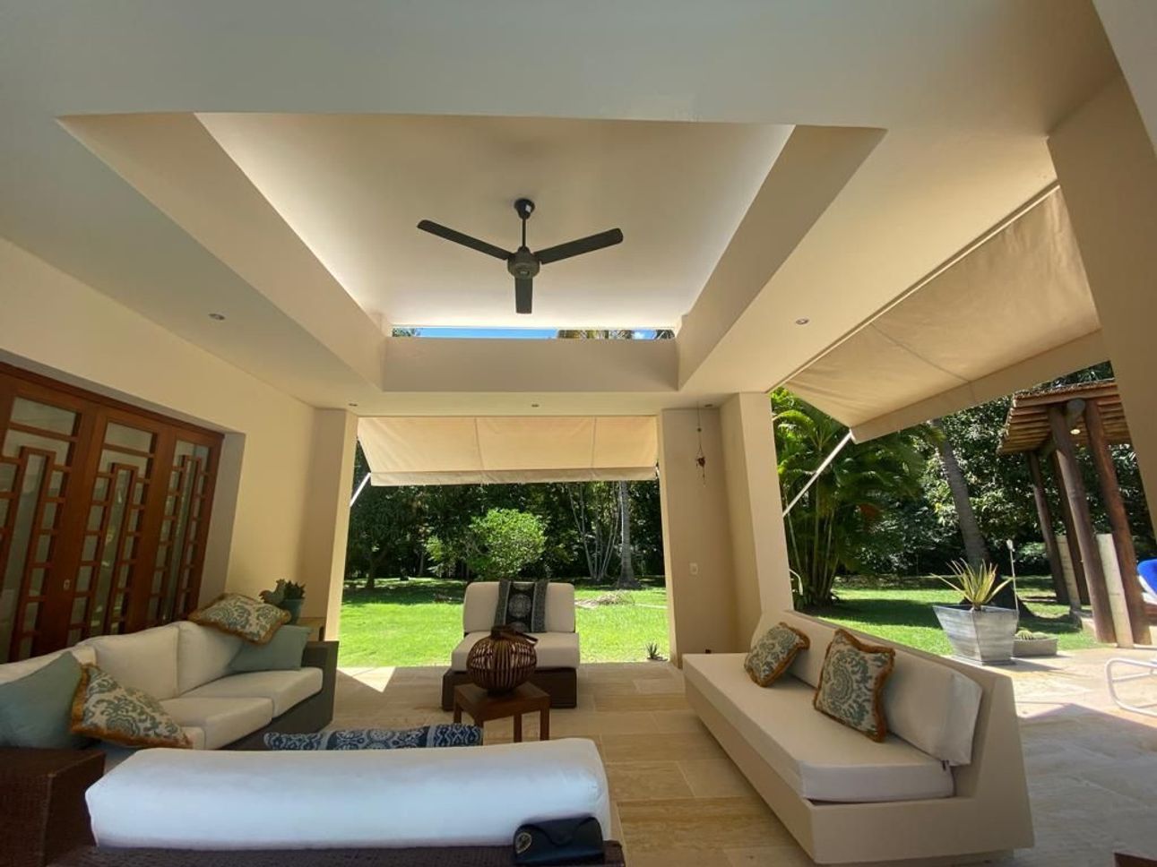 El módulo principal incluye sala-comedor con aire acondicionado, cocina abierta equipada, zona de lavandería con baño de servicio y sala exterior. El segundo módulo alberga la habitación principal con baño privado, vestier, sala interna y estar externo. El tercer módulo cuenta con tres habitaciones, cada una con aire acondicionado, baño privado y armario.