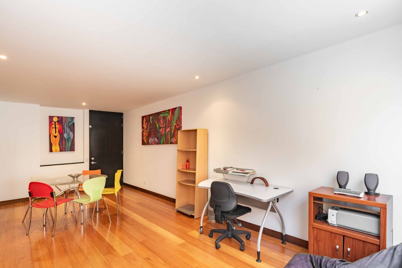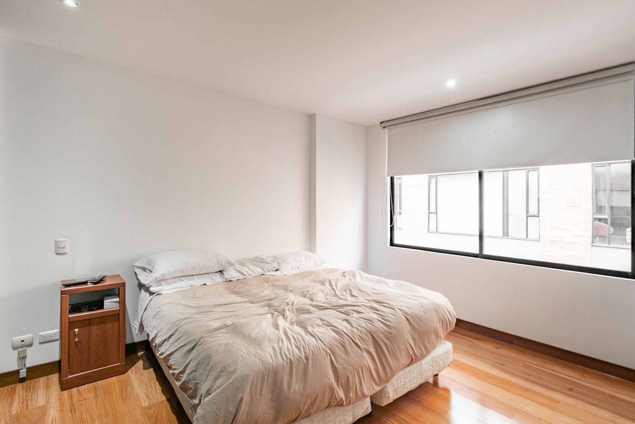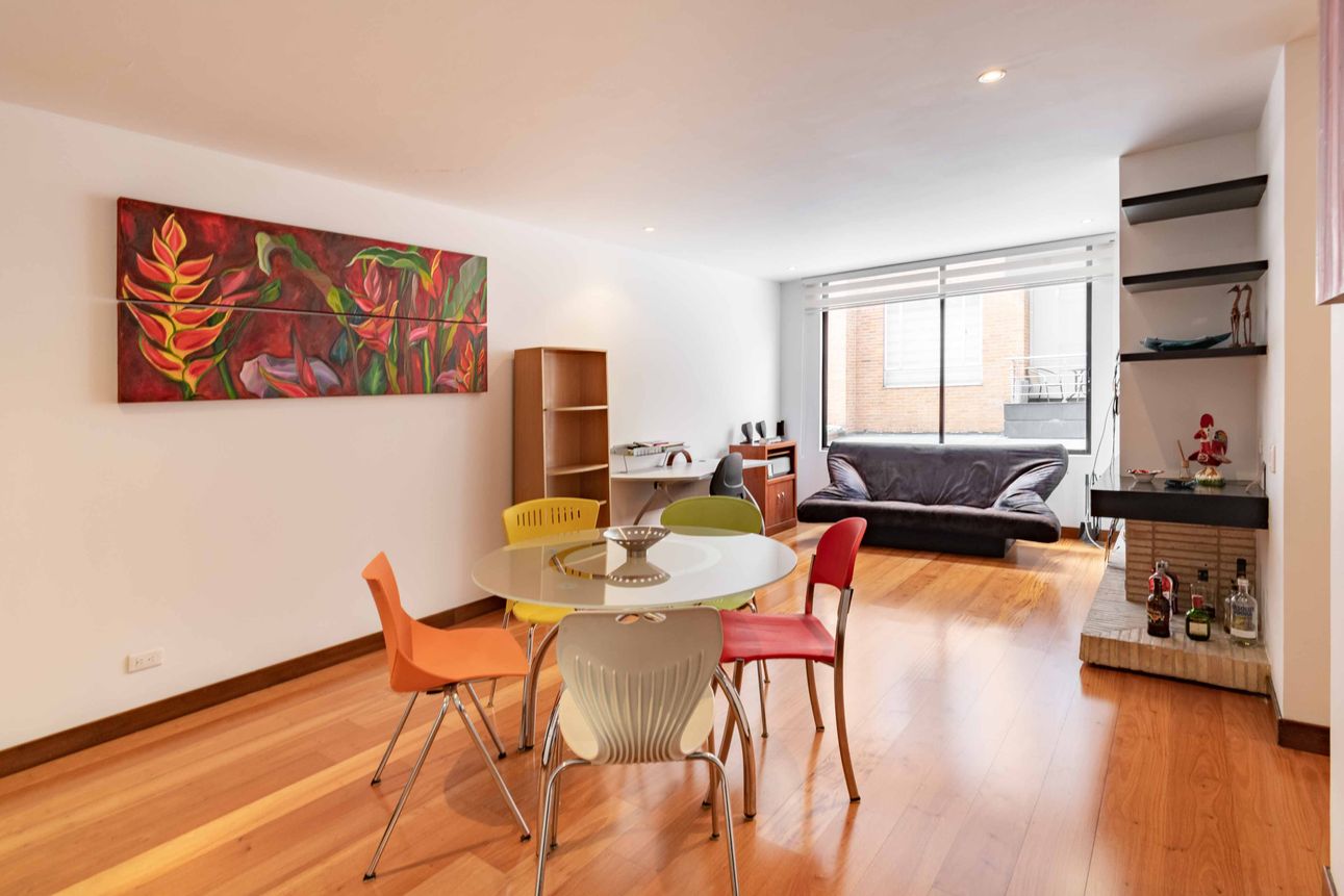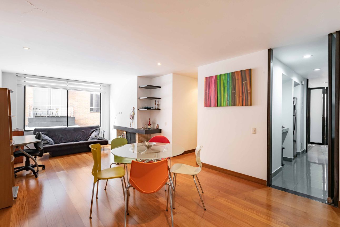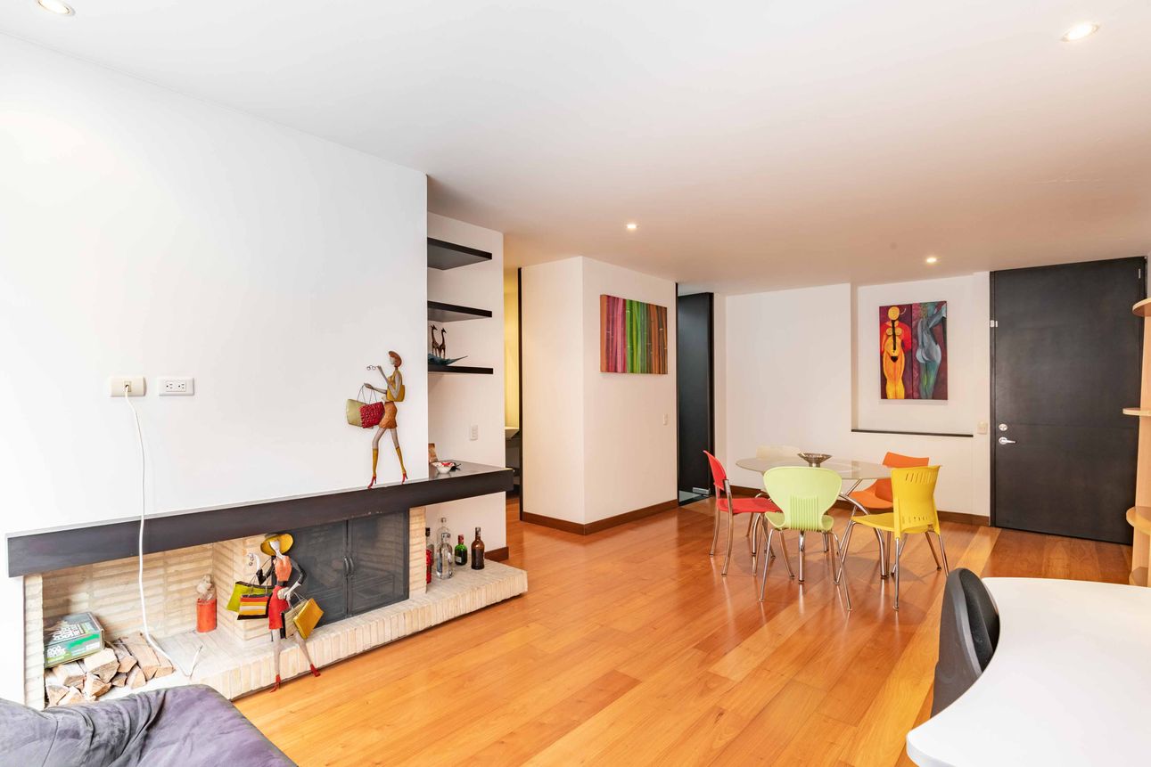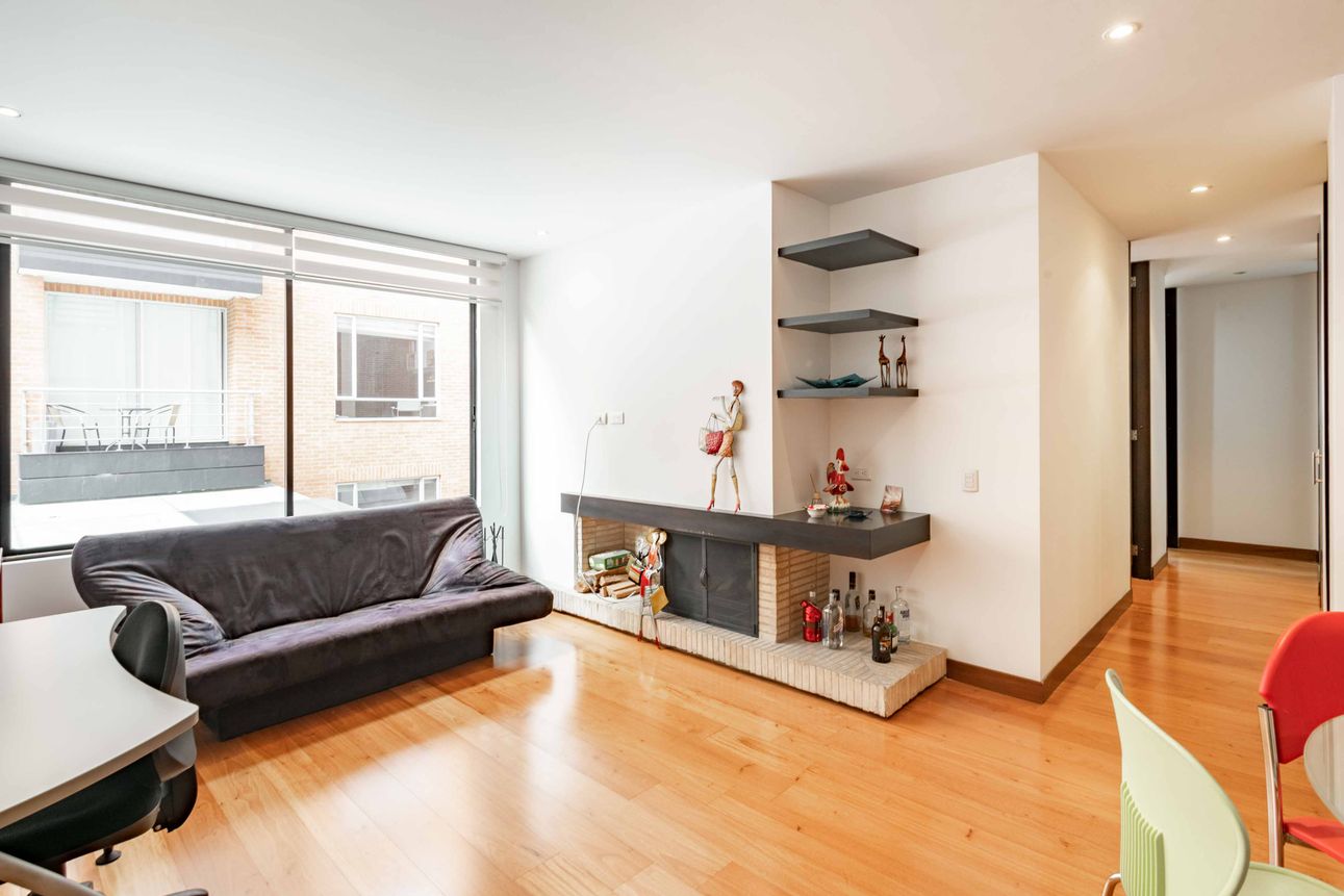 En el corazón de Chicó Navarra se encuentra este acogedor apartamento en arriendo. Ofrece la calidez de un hogar con piso de madera natural que abarca todo el espacio, aportando una atmósfera elegante y acogedora. La chimenea a leña es perfecta para disfrutar de las noches frías bogotanas, mientras que la iluminación y la ventilación natural hacen de cada rincón un espacio iluminado y agradable.