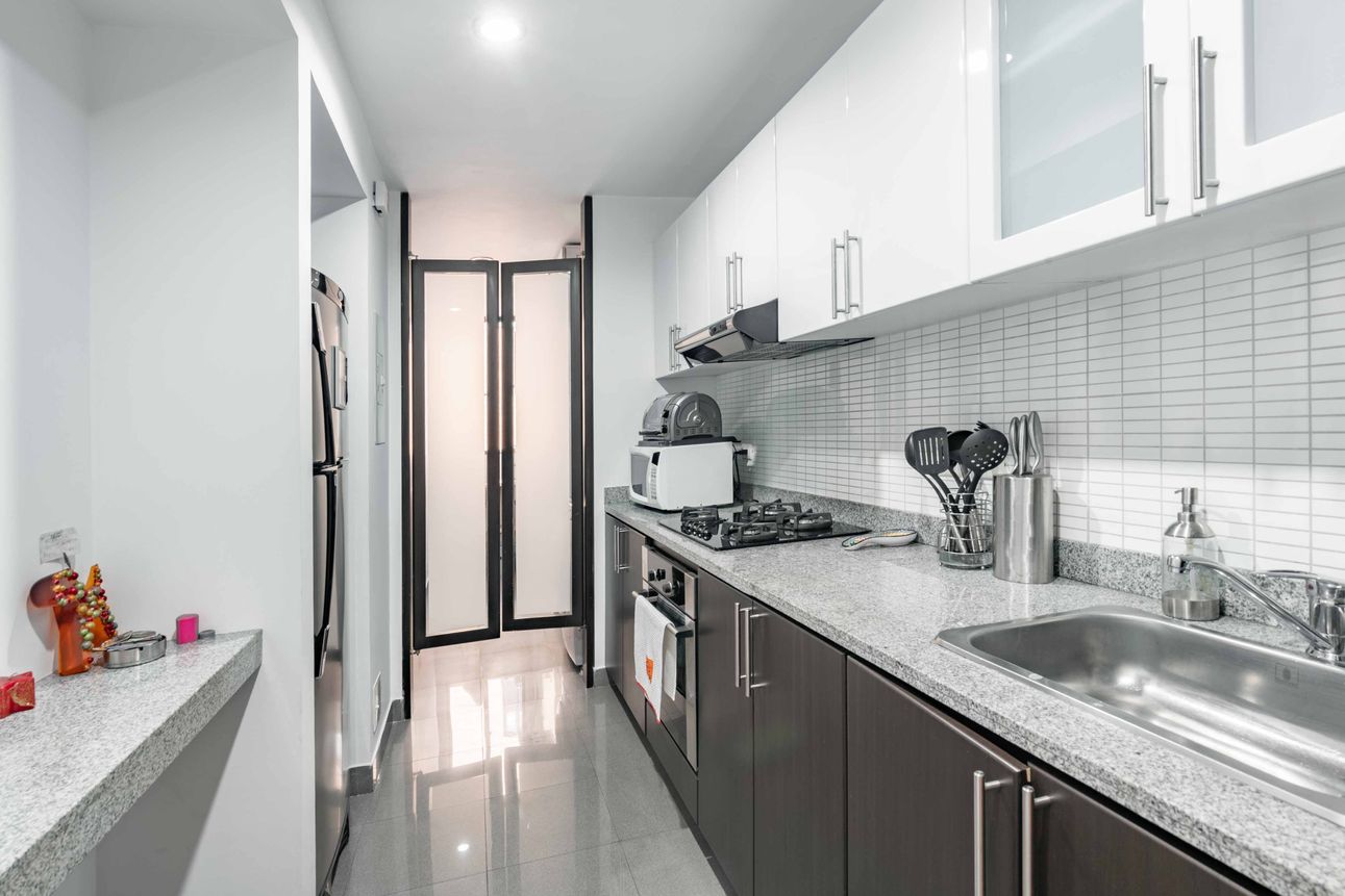 El apartamento cuenta con una cocina integral con despensa y estufa a gas, ideal para aquellos que disfrutan cocinar. Además, tiene dos habitaciones cómodas, parqueaderos cubiertos, seguridad 24 horas con CCTV, y portería. Situado en un tercer piso con ascensor, ofrece una vista encantadora a la ciudad, garantizando la tranquilidad y comodidad.
