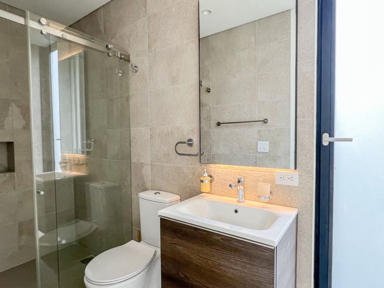 Este apartamento tiene acabados AAA, sistema de sonido, Viedo Beam con ascensor eléctrico empotrado en techo, blackouts eléctricos, lavaplatos, mricohondas, torre de hornos todos marca Smeg, estufa de inducción, interruptores con dimer y ventaneria anti ruido, puerta de seguridad, pisos en madera.