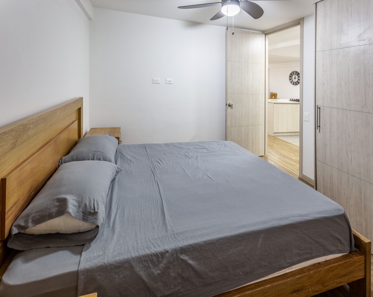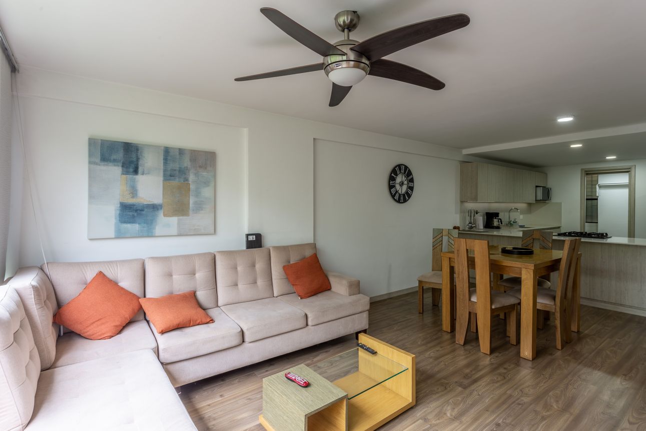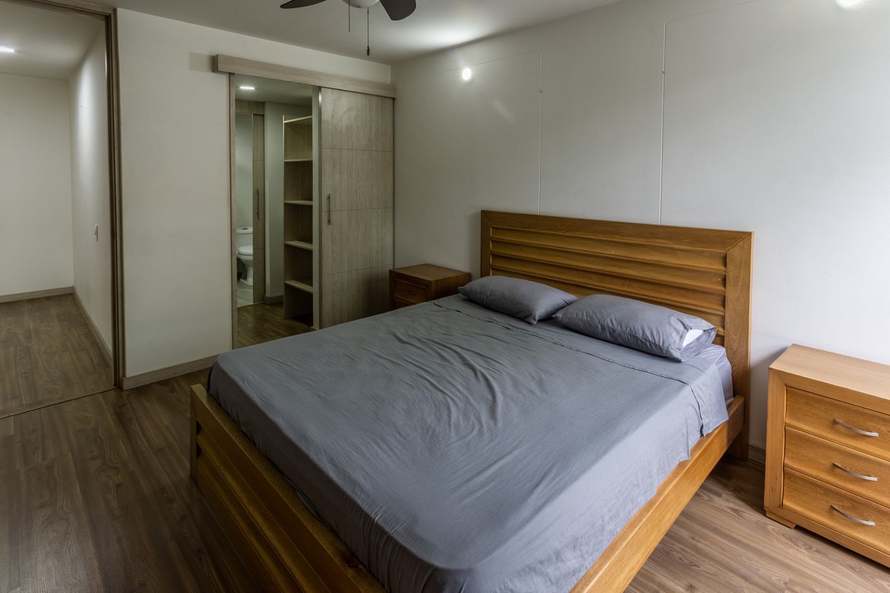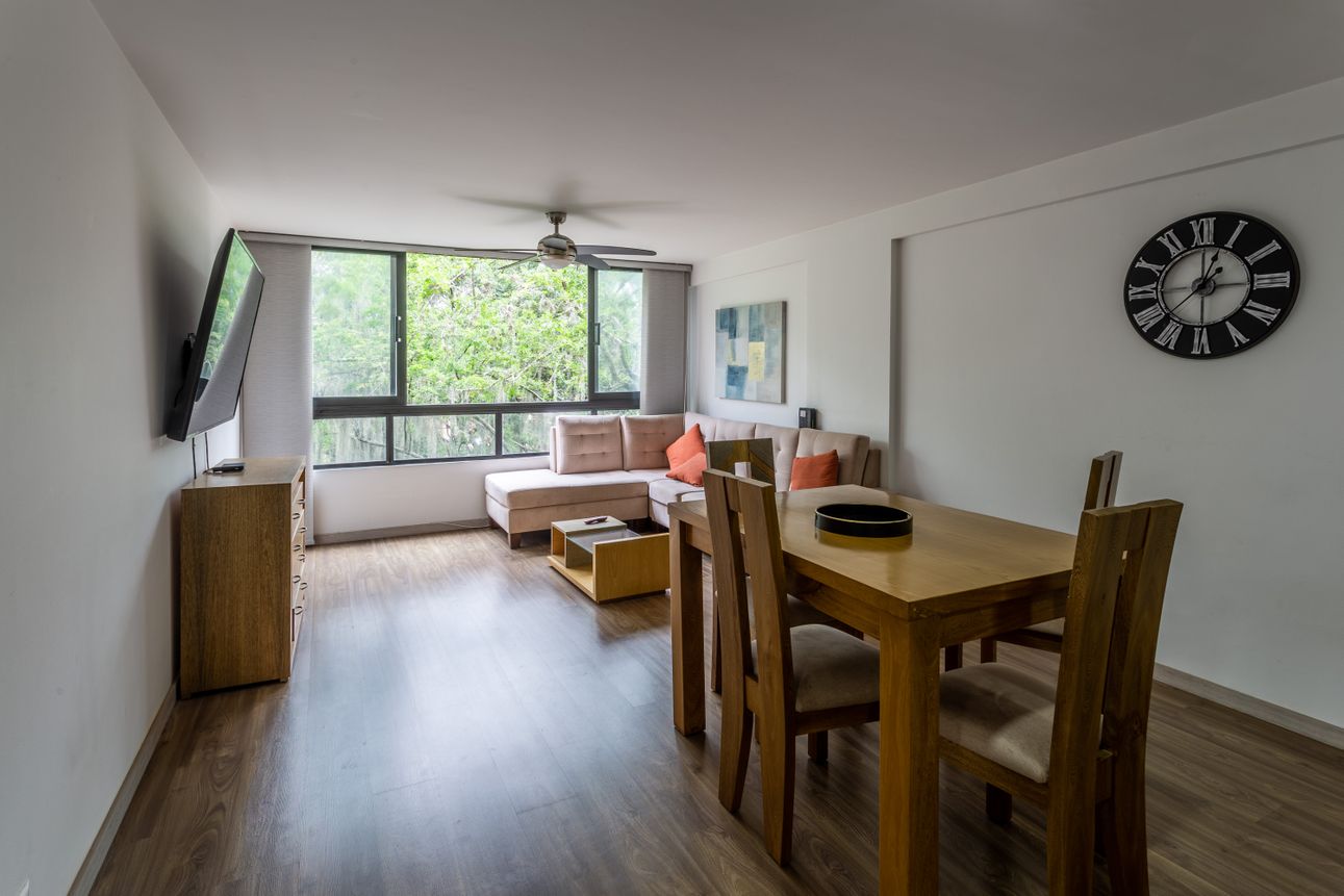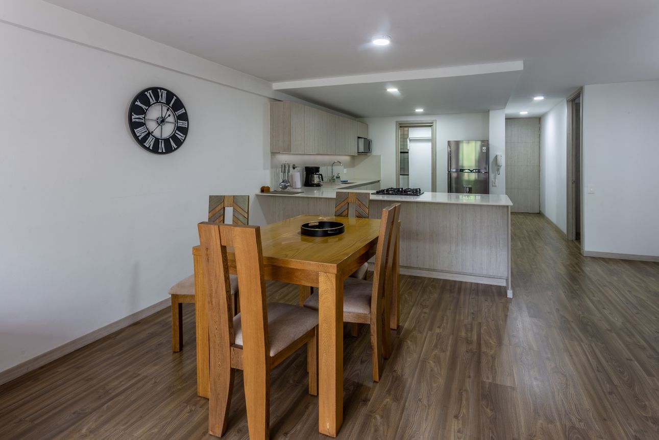 El apartamento se distingue por su amplia cocina estilo americano remodelada, incluyendo una isla. La madera laminada le da al espacio un toque sofisticado y moderno, y combinada con el gas natural y otros electrodomésticos, garantiza una experiencia confortable. Este hogar de dos habitaciones también ofrece un closet de vestidor, un cuarto de lavandería y un parqueadero. La seguridad con servicio de portería y guardia de seguridad las 24 horas.