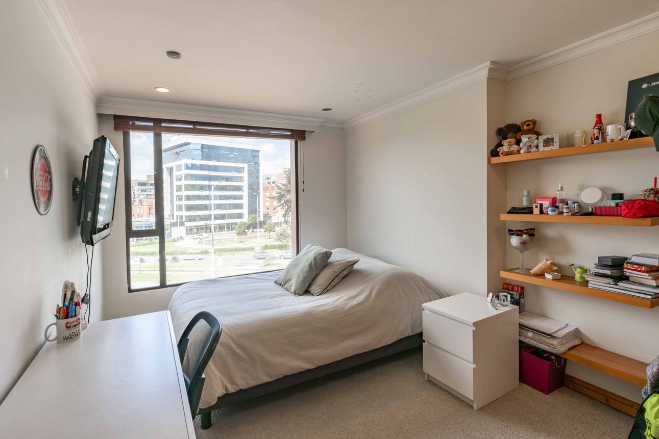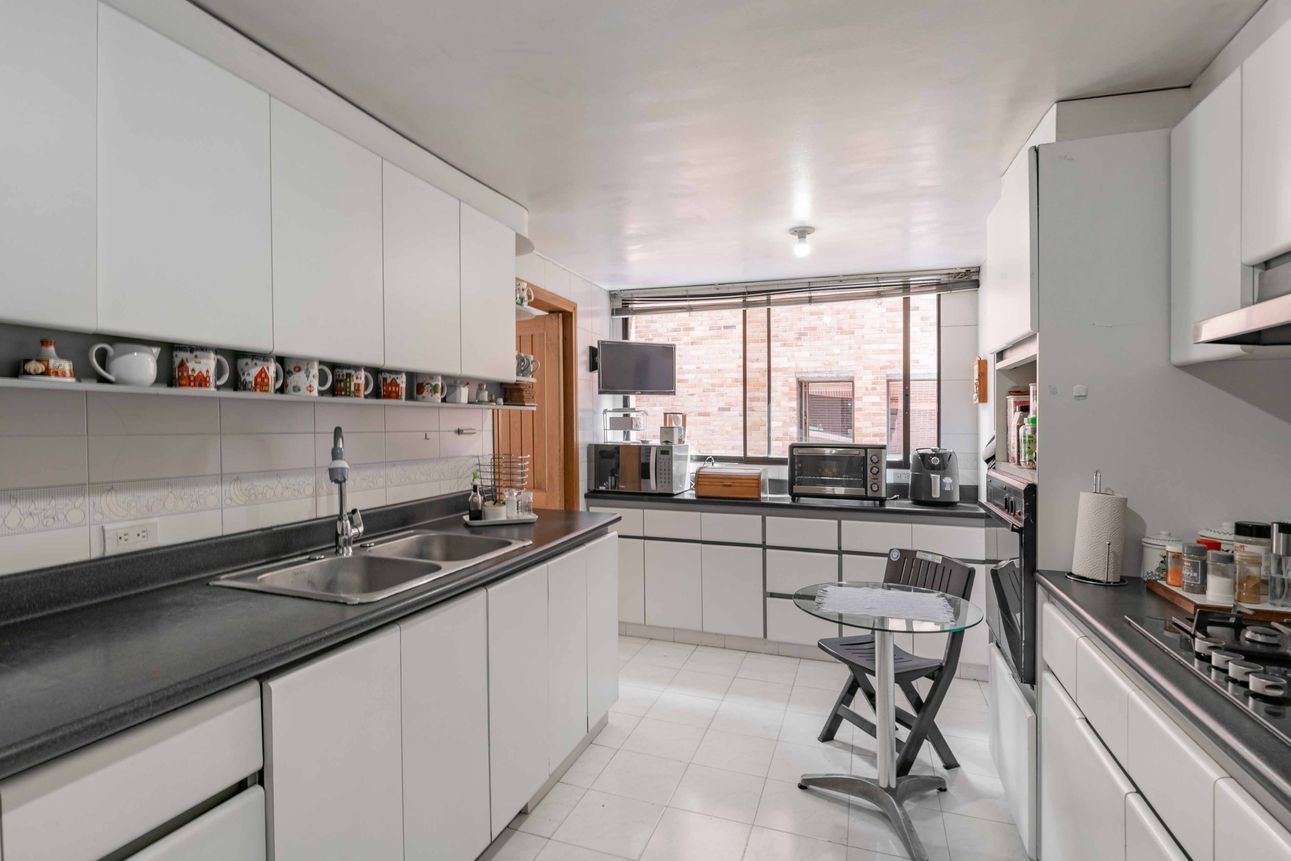 Con tres habitaciones —la principal con vestier y baño privado—, dos baños adicionales, estudio, sala amplia, comedor independiente y cocina cerrada con zona de lavandería y cuarto y baño de servicio. Incluye dos parqueaderos y depósito.