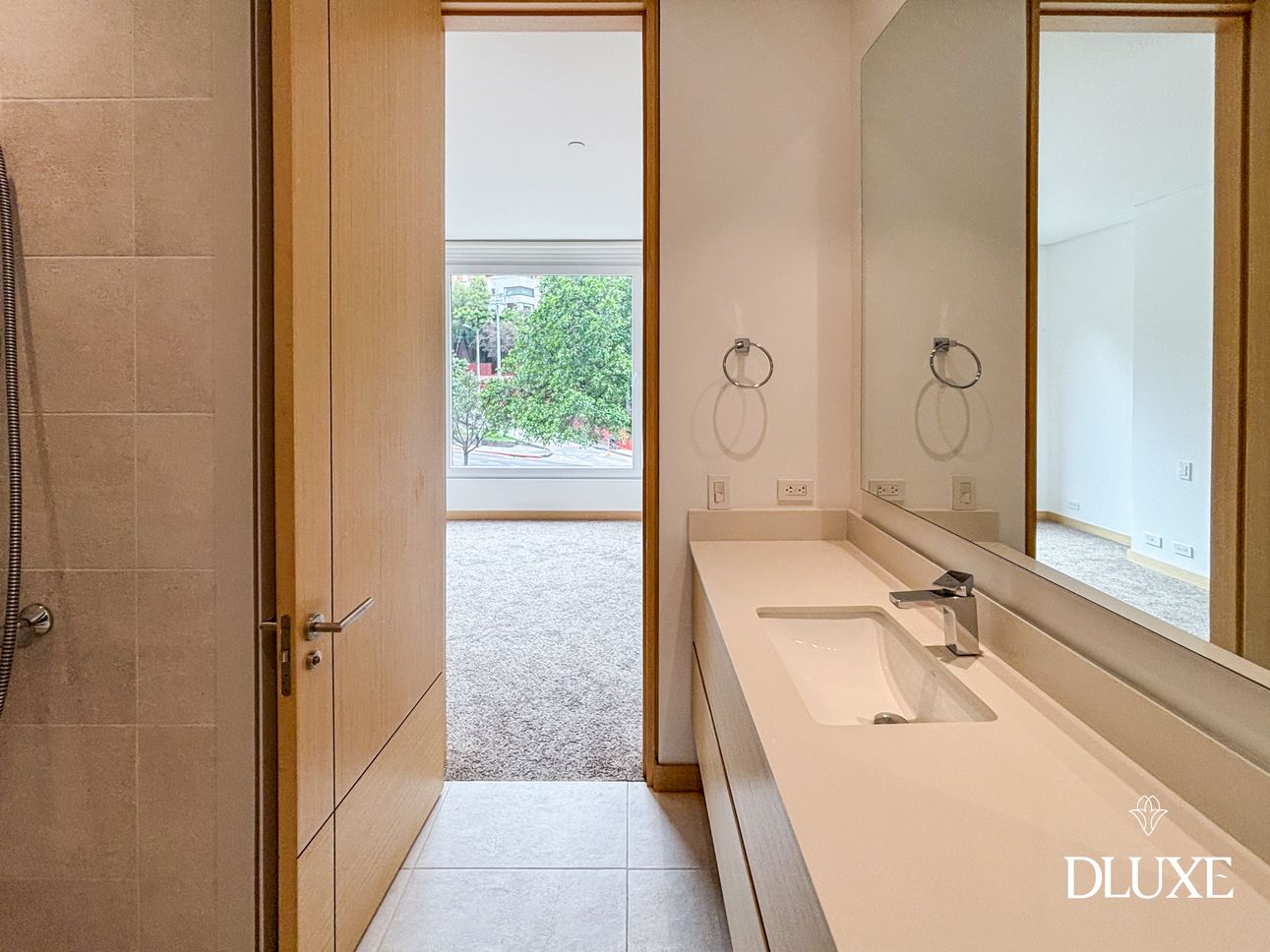 El apartamento cuenta con dos habitaciones, cada una con su baño privado. La habitación principal se destaca por su walk-in closet y mayor amplitud.