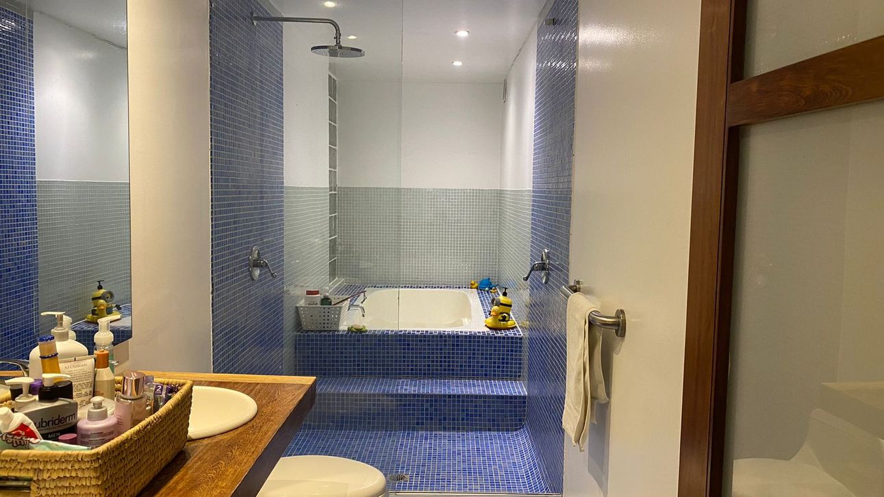 Es un apartamento remodelado, dúplex, de 180 mts, en el segundo nivel están las dos amplias habitaciones y con buena luz, la principal con vista verde hacia la cañada, walk-in closet, baño privado con ducha y una deliciosa tina.