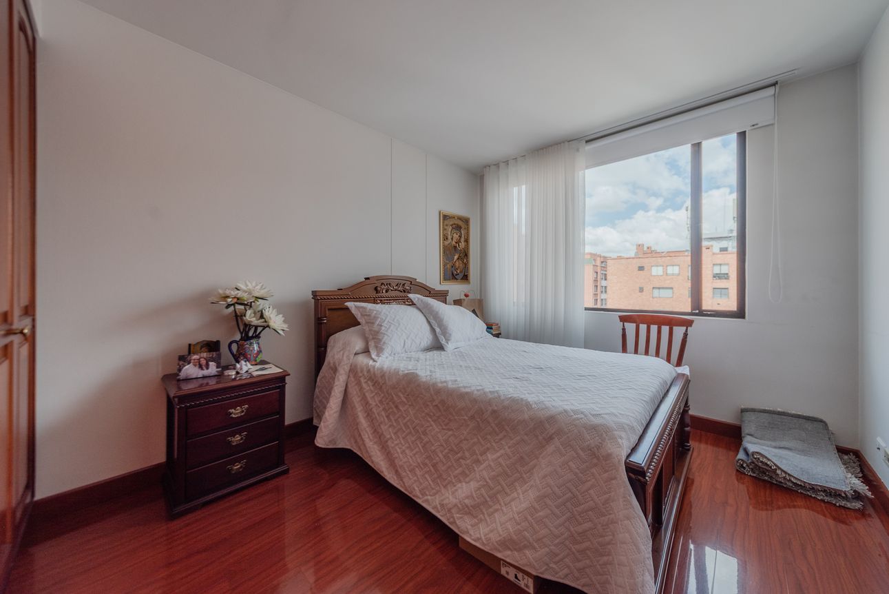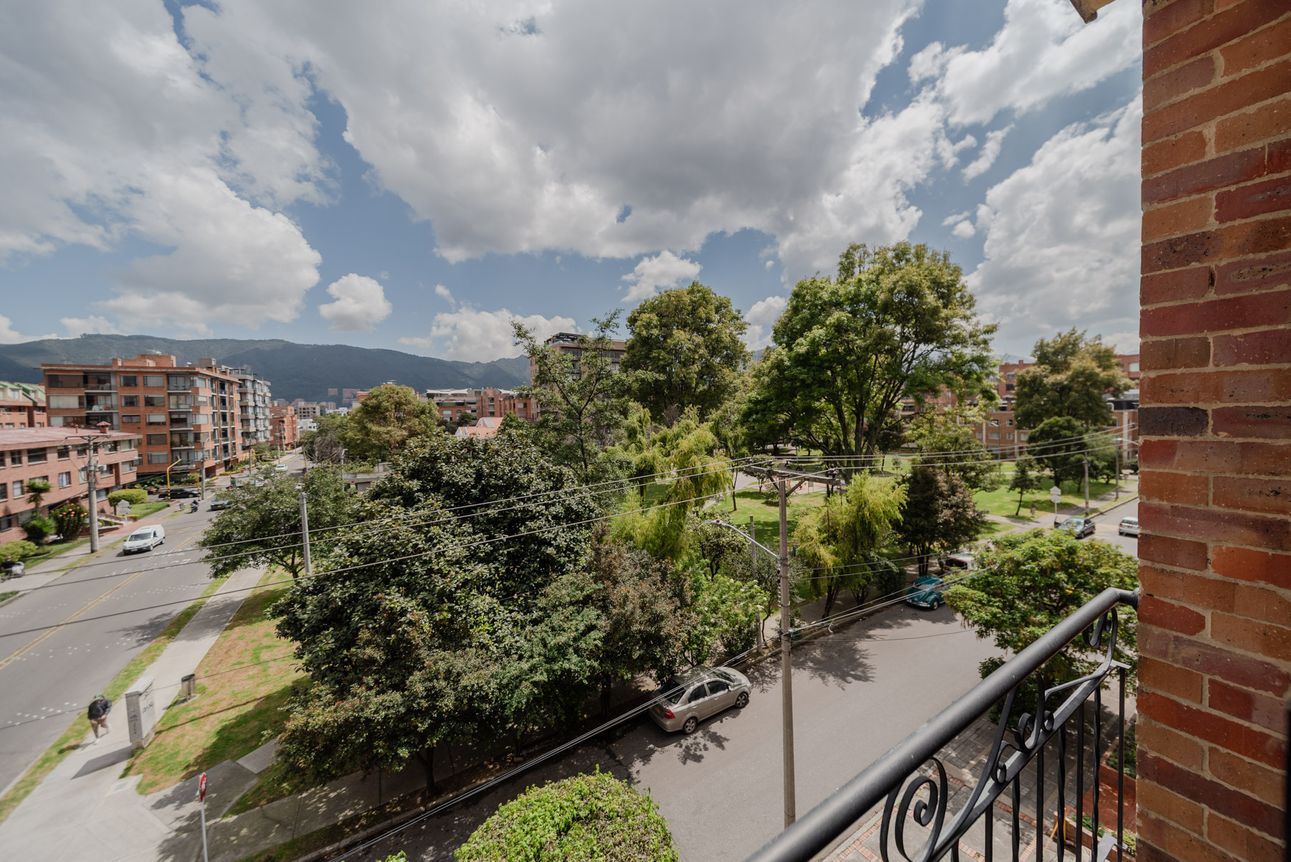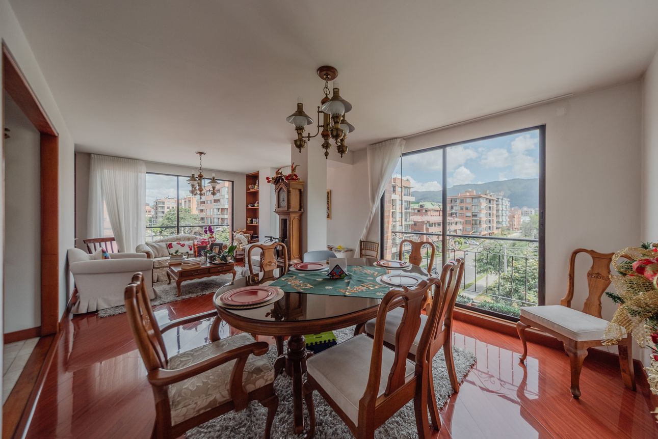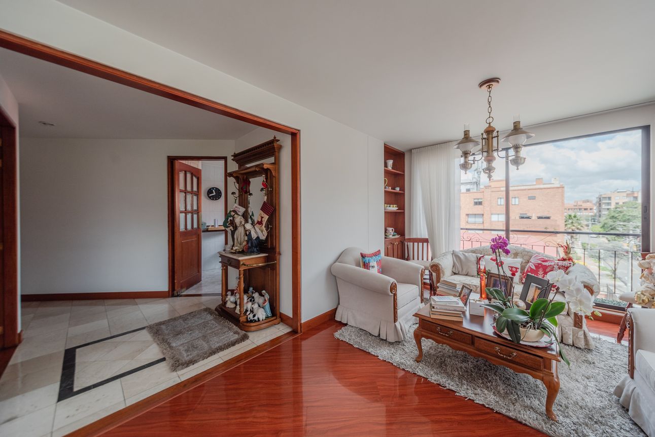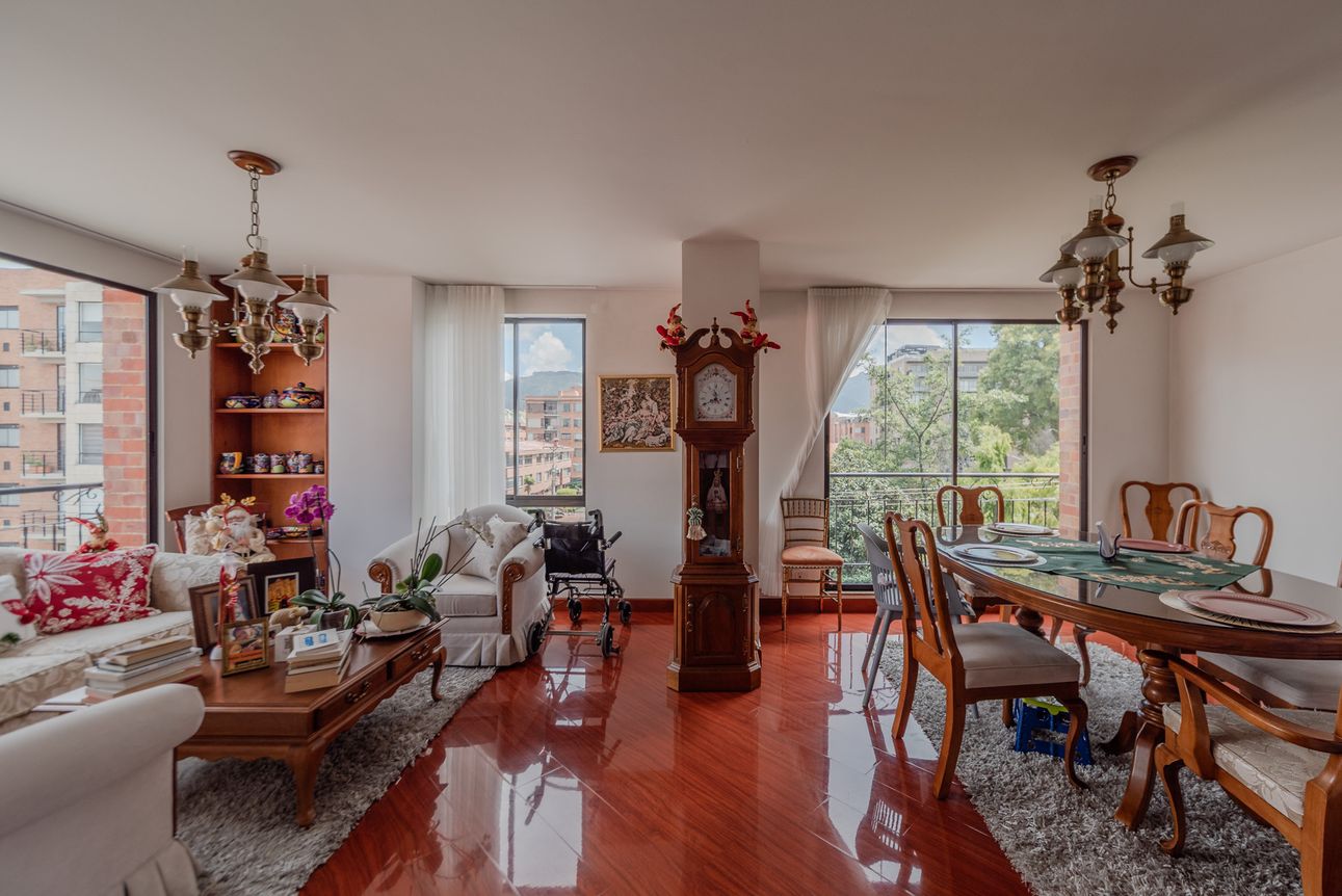 Consta de sala- comedor en un mismo ambiente con chimenea a leña, estudio cerrado, baño social, cocina cerrada con la zona de lavandería semi-independiente, cuarto y baño de servicio. Consta de 3 habitaciones, la principal con baño privado y vestier, las alcobas auxiliares comparten un baño. El apartamento cuenta con tres balcones en la sala, comedor y habitación principal.