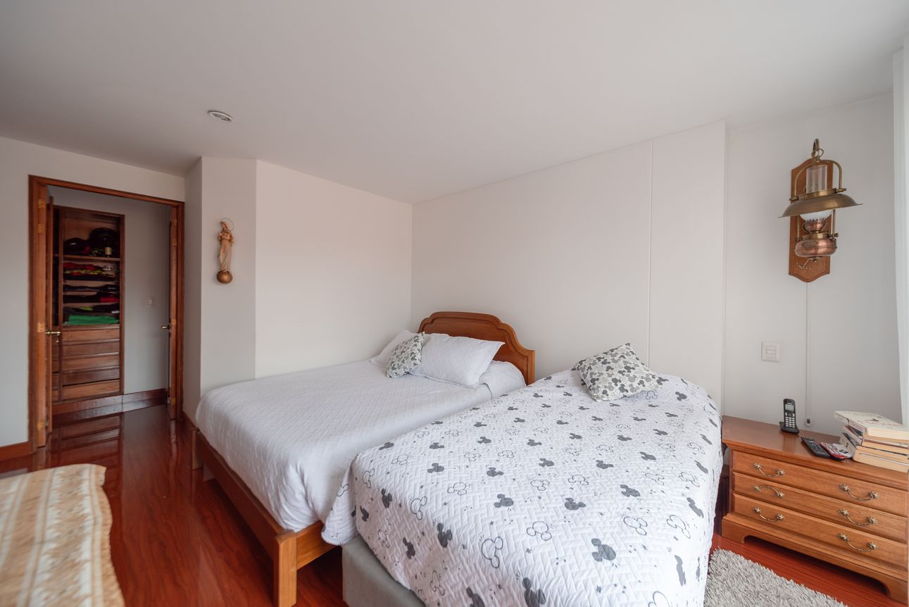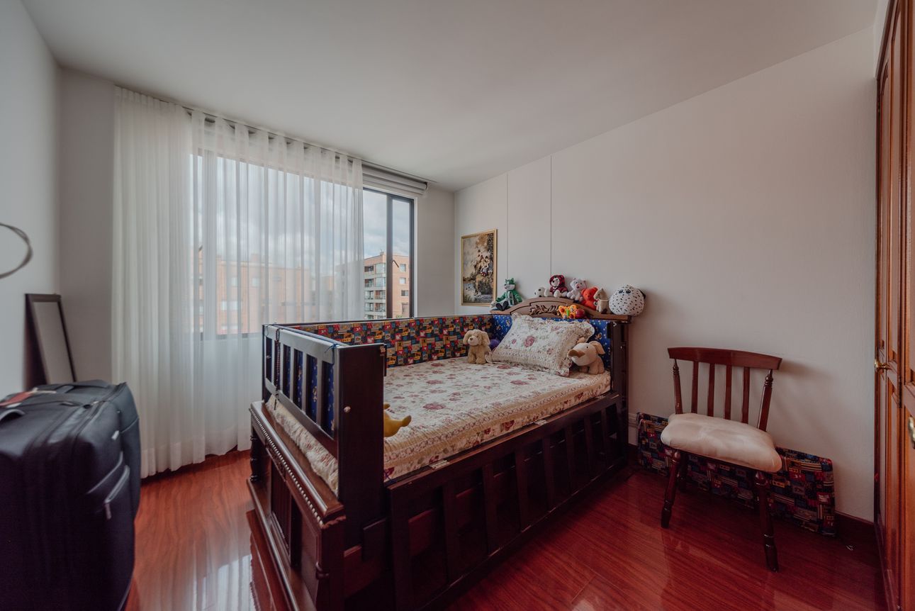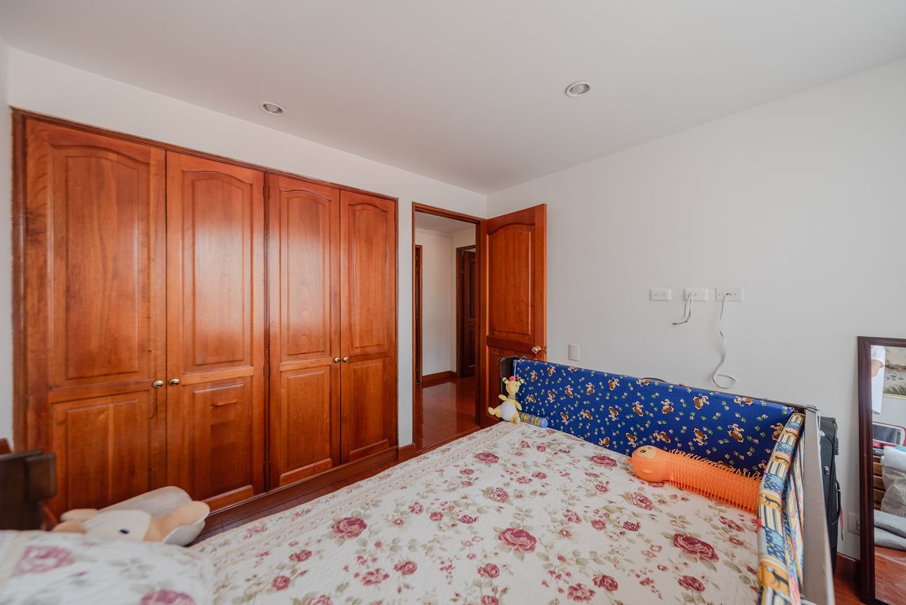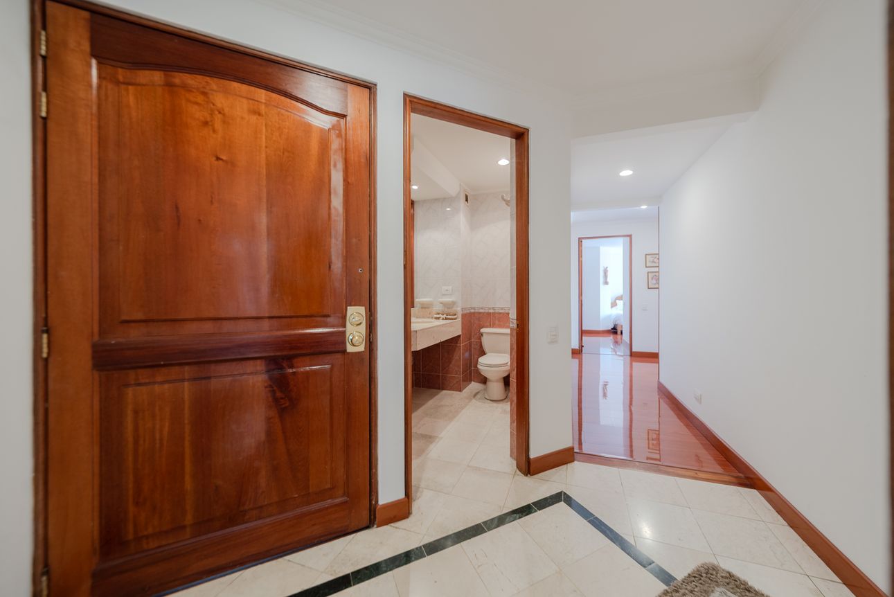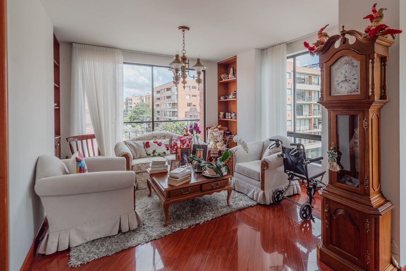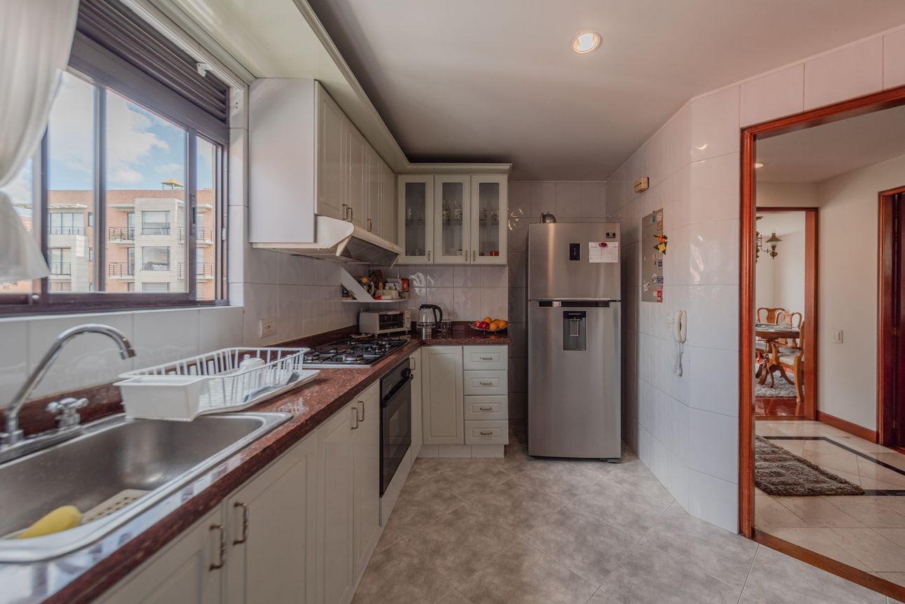 Consta de sala- comedor en un mismo ambiente con chimenea a leña, estudio cerrado, baño social, cocina cerrada con la zona de lavandería semi-independiente, cuarto y baño de servicio. Consta de 3 habitaciones, la principal con baño privado y vestier, las alcobas auxiliares comparten un baño. El apartamento cuenta con tres balcones en la sala, comedor y habitación principal.