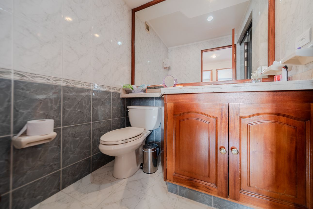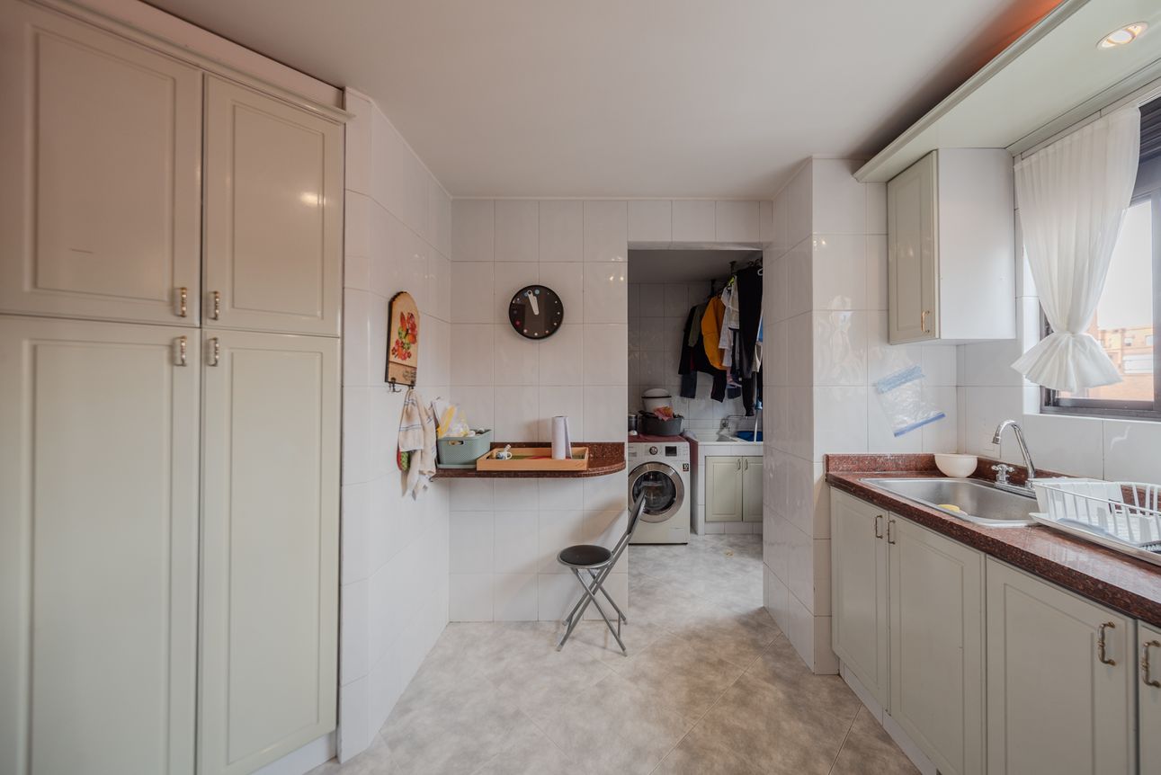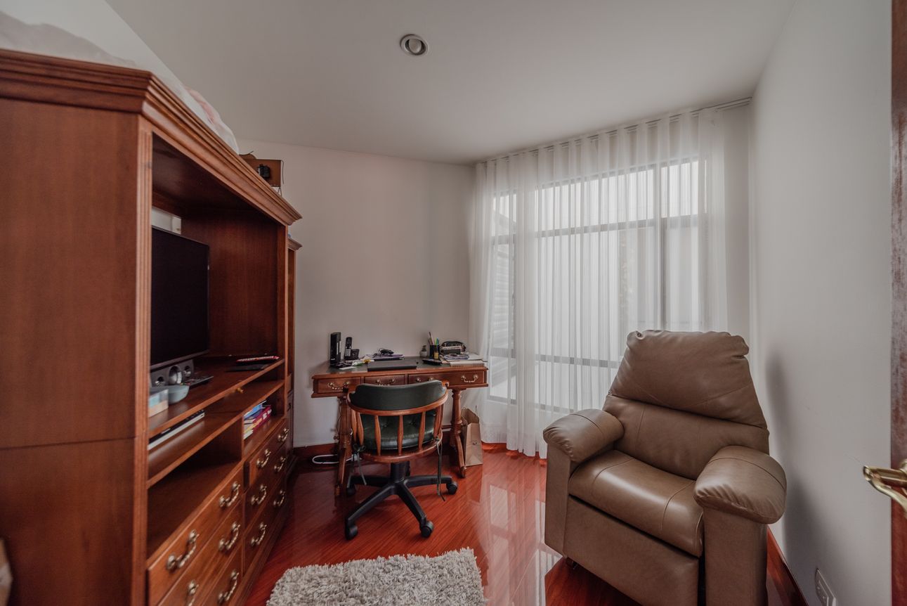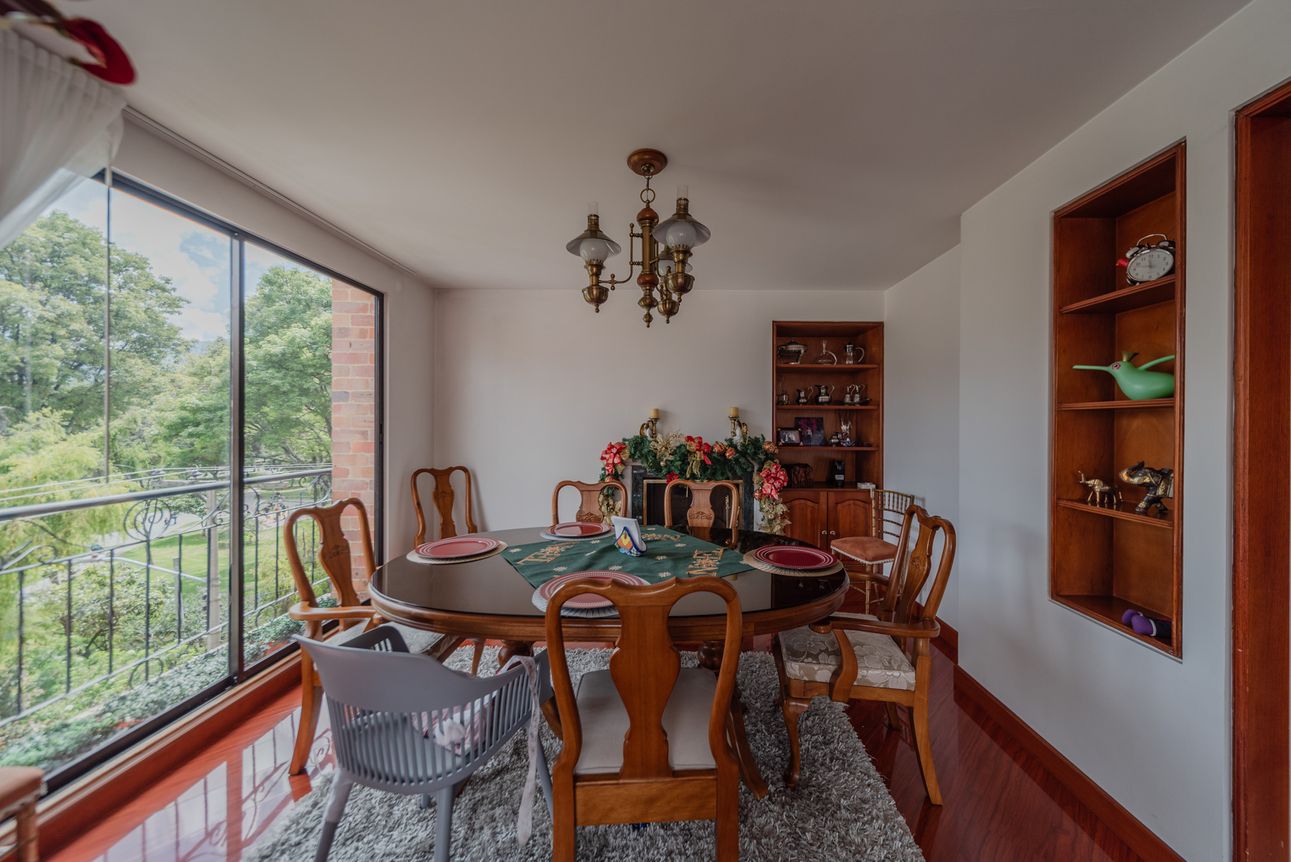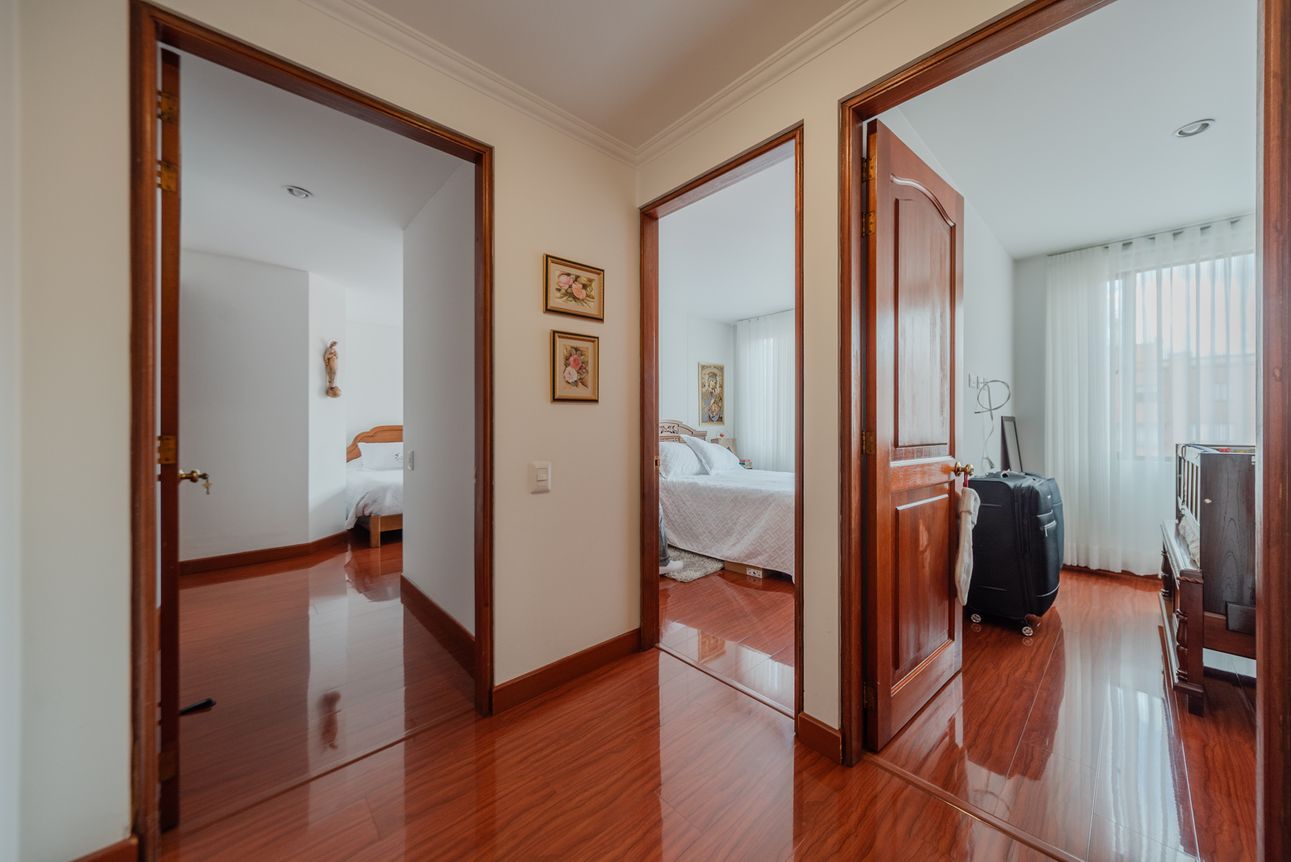 Consta de sala- comedor en un mismo ambiente con chimenea a leña, estudio cerrado, baño social, cocina cerrada con la zona de lavandería semi-independiente, cuarto y baño de servicio. Consta de 3 habitaciones, la principal con baño privado y vestier, las alcobas auxiliares comparten un baño. El apartamento cuenta con tres balcones en la sala, comedor y habitación principal.