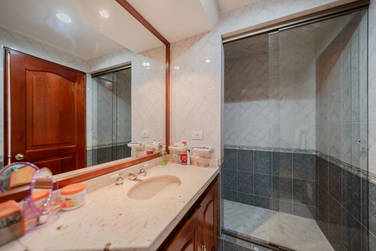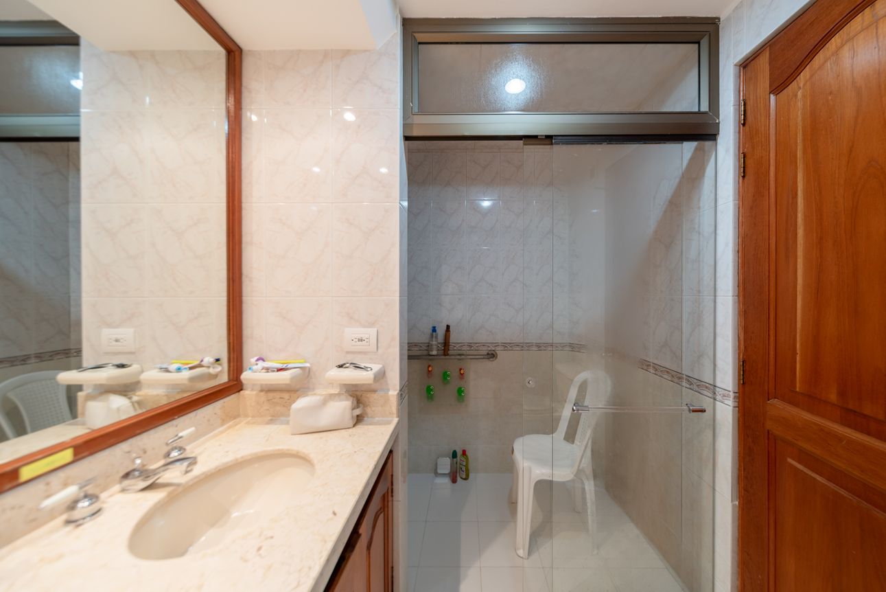Apartamento ubicado en el piso 4 (acceso por ascensor), esquinero exterior, con vista al parque; tiene un área construída de 133.2 m2 y área privada de 121.6 m2.