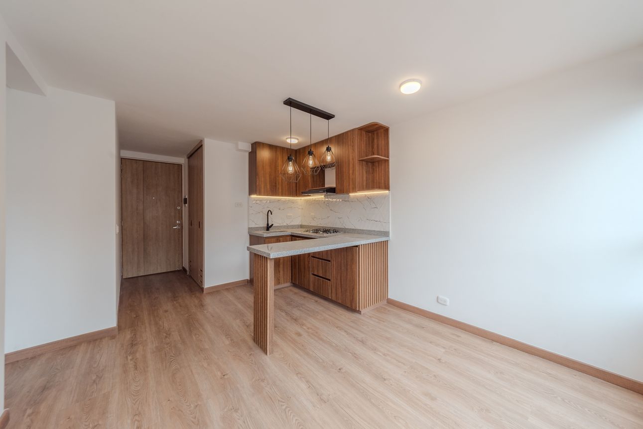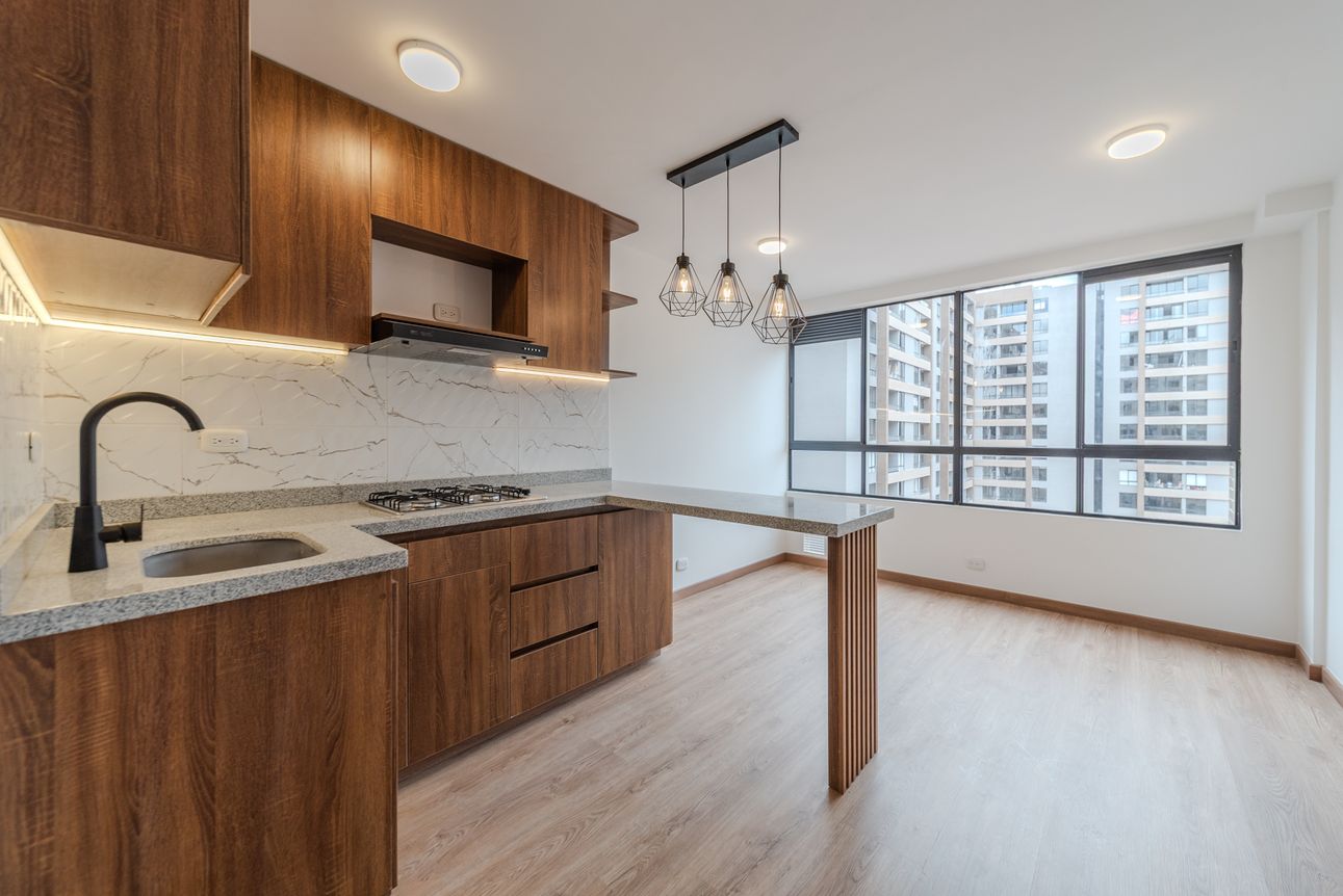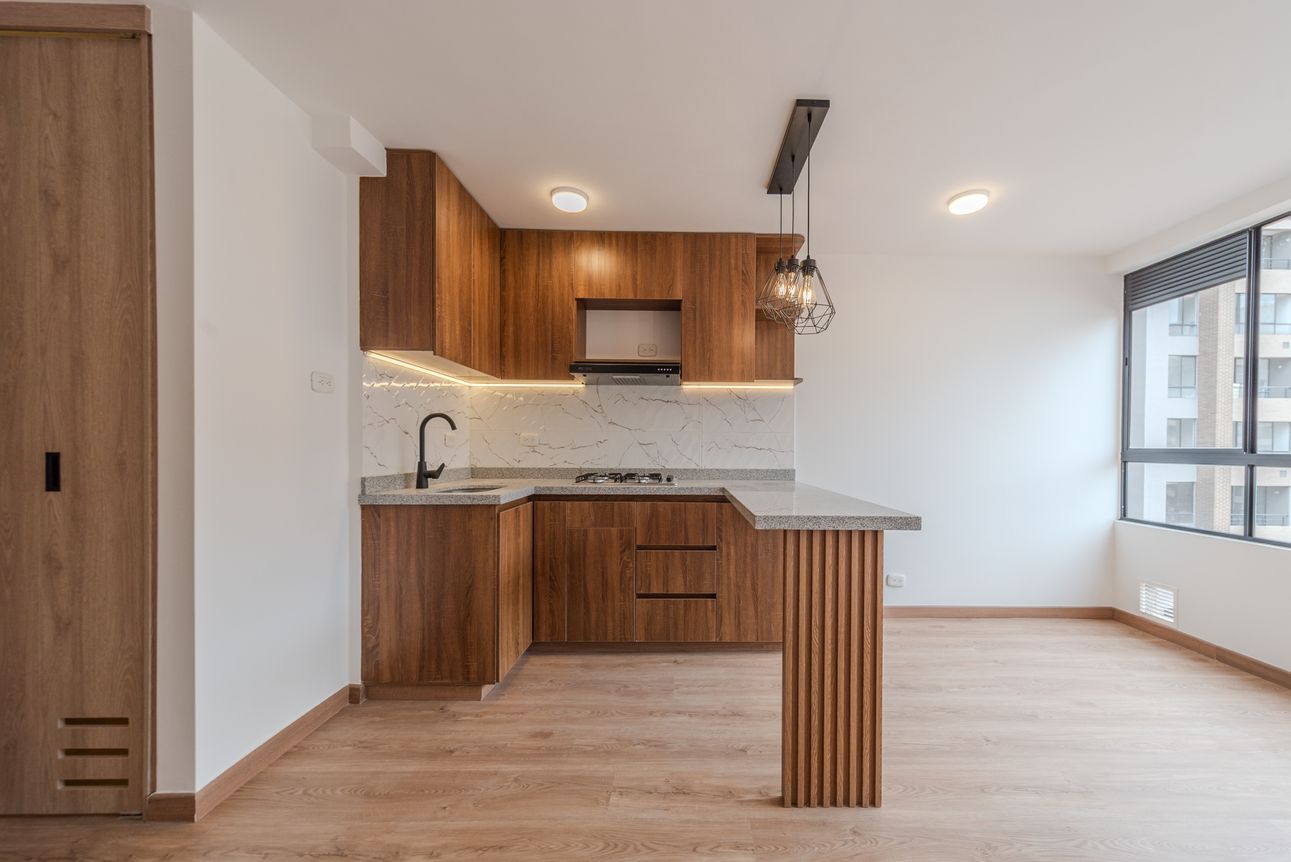 Moderno apartamento de dos habitaciones en Conjunto con Club House. El apartamento cuenta con excelentes acabados en madera, amplia zona social cocina abierta, zona de lavandería independiente con lavadero. Dos habitaciones y un amplio baño completo. Por su parte, el conjunto cuenta con salón comunal, vigilancia 24 horas, parqueadero de visitantes, gimnasio, piscina, terraza comunal, zona infantil, co-working, teatrino y parqueaderos comunales por asignación de la administación.