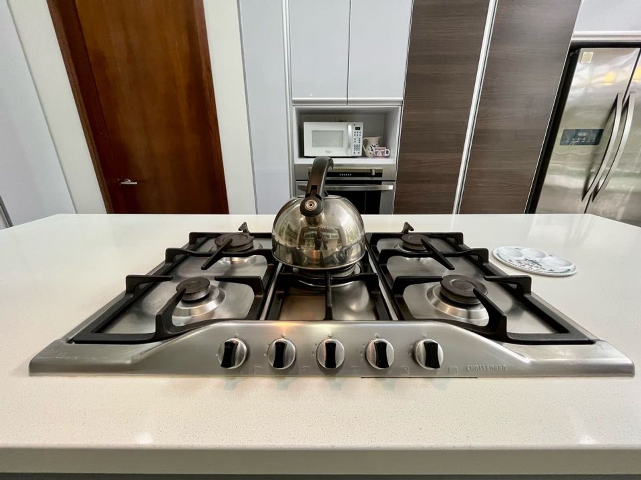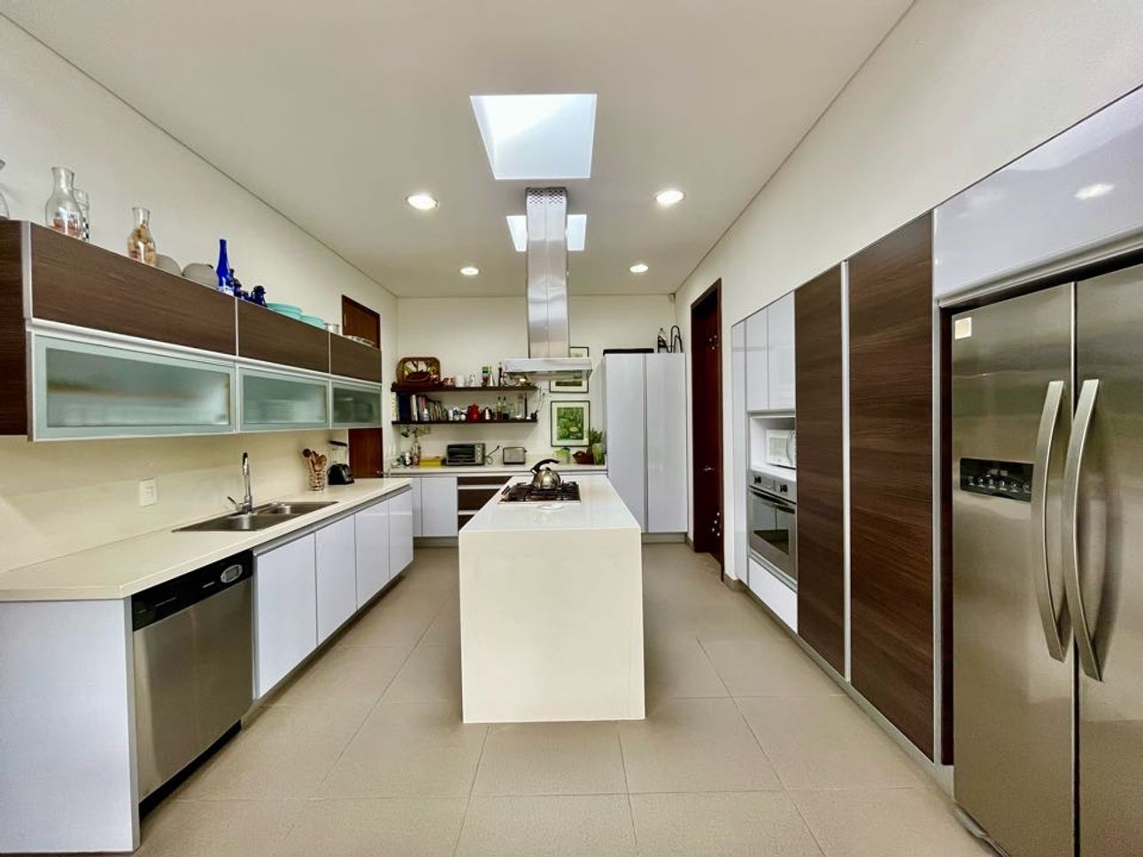La cocina abierta es perfecta para los amantes de la gastronomía, y el estudio independiente ofrece una vista encantadora. El salón cuenta con una chimenea acogedora para esos días frescos. Además, los cuatro dormitorios tienen sus propios baños, y hay un cuarto de servicio y área de lavandería que añaden comodidad. Los jardines espaciosos son perfectos para las mascotas y para disfrutar del aire puro que rodea la propiedad.
