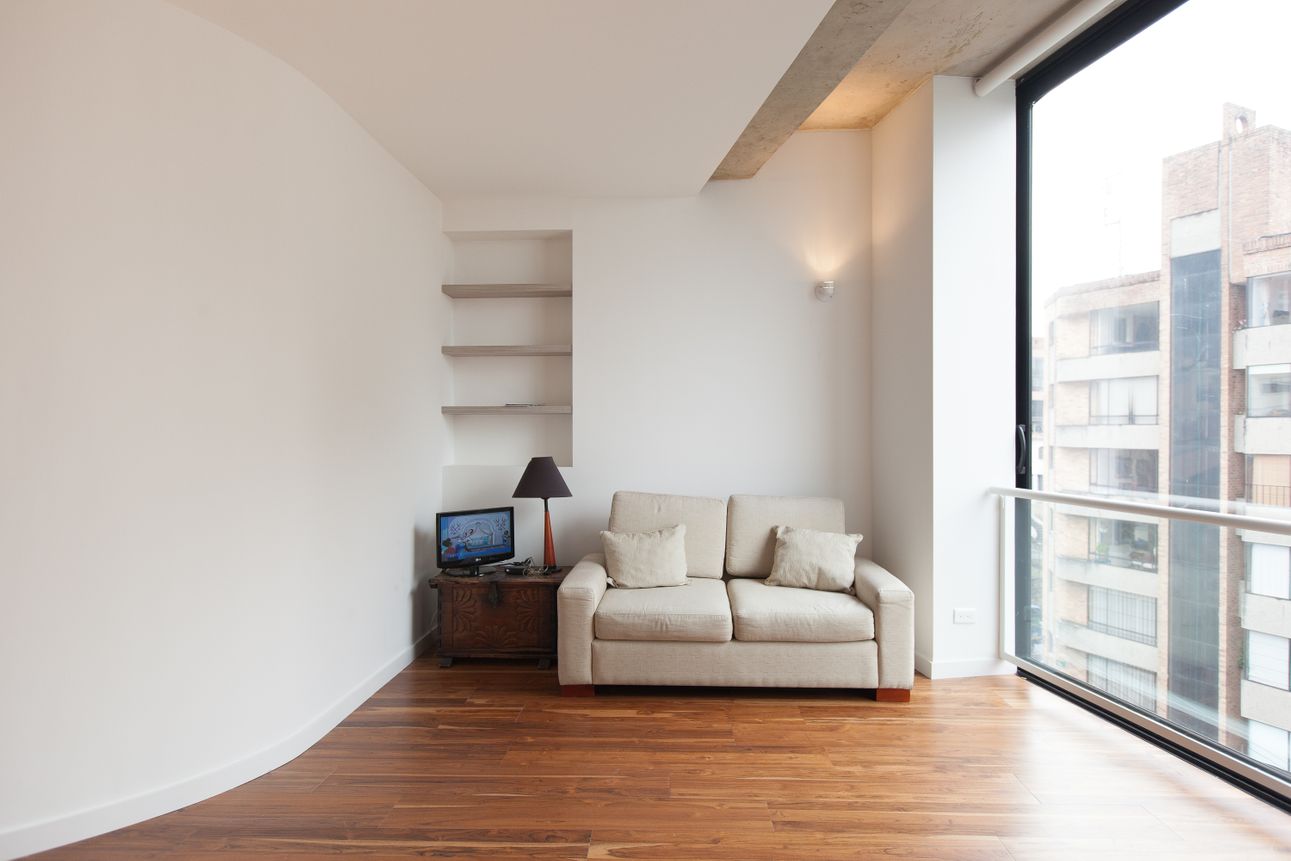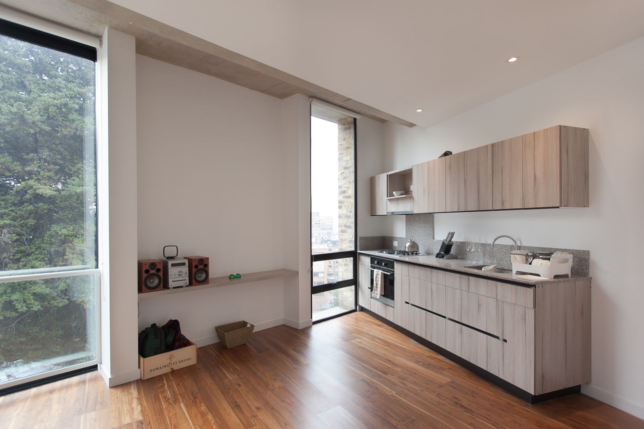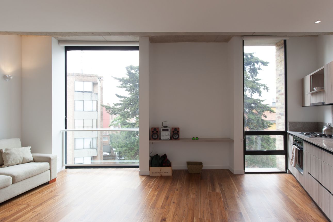 El área social cuenta con un balcón interior gracias a la ventana deslizante, es un diseño característico en las obras del arquitecto Oberlænder. Los mesones son en granito y el piso es laminado con chapilla de madera natural. Los servicios son estrato 5, con gas natural.