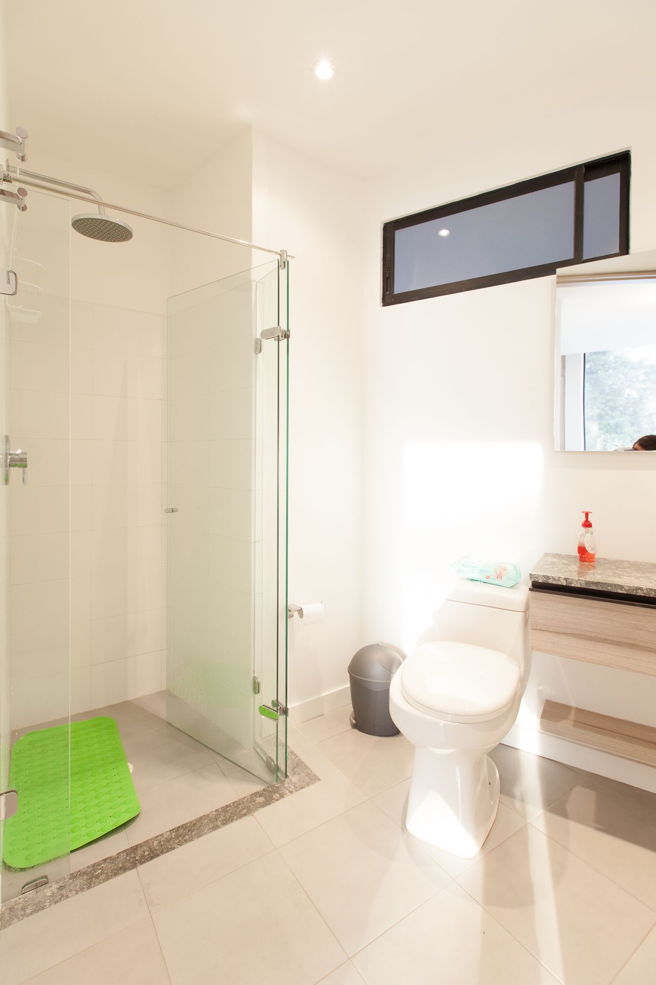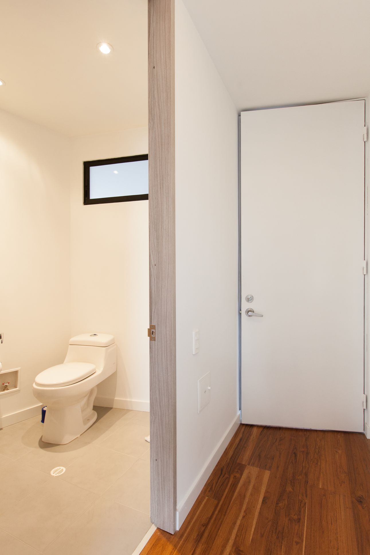 Se ingresa por el piso superior a la zona social con cocina abierta, y tiene un baño social con area para instalar la lavadora, ventilado naturalmente. En el piso inferior se encuentra la habitación con el estudio abierto, un depósito bajo la escalera y el baño principal.