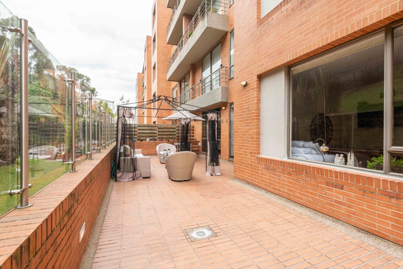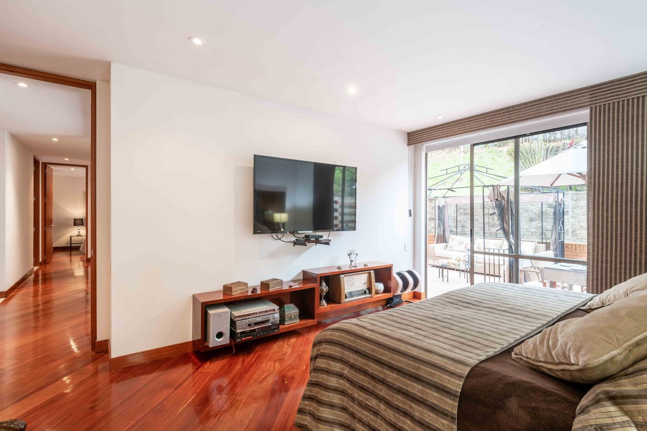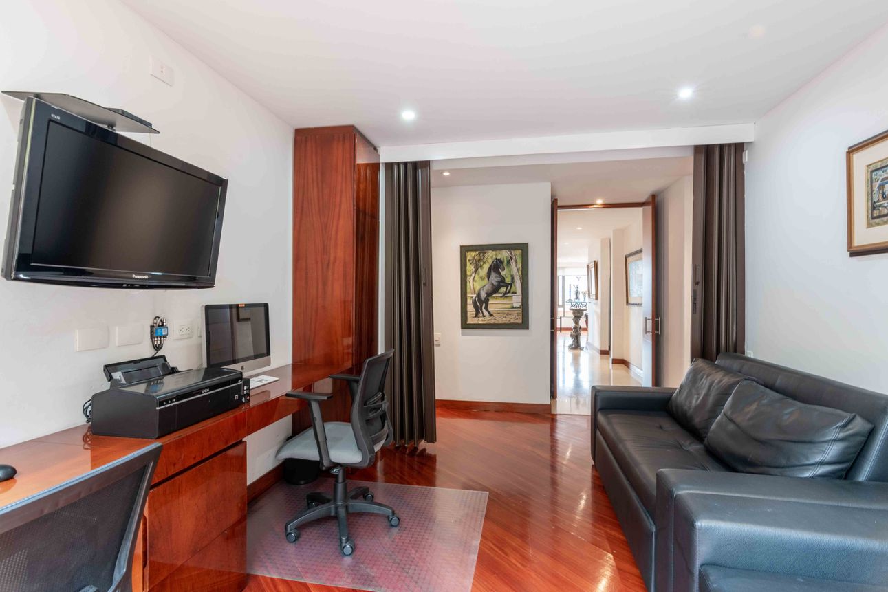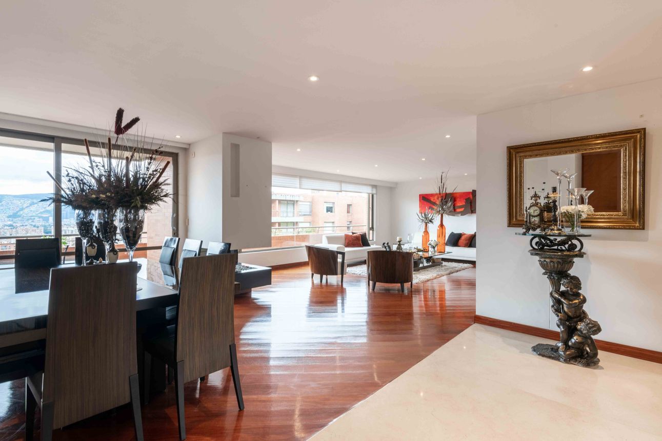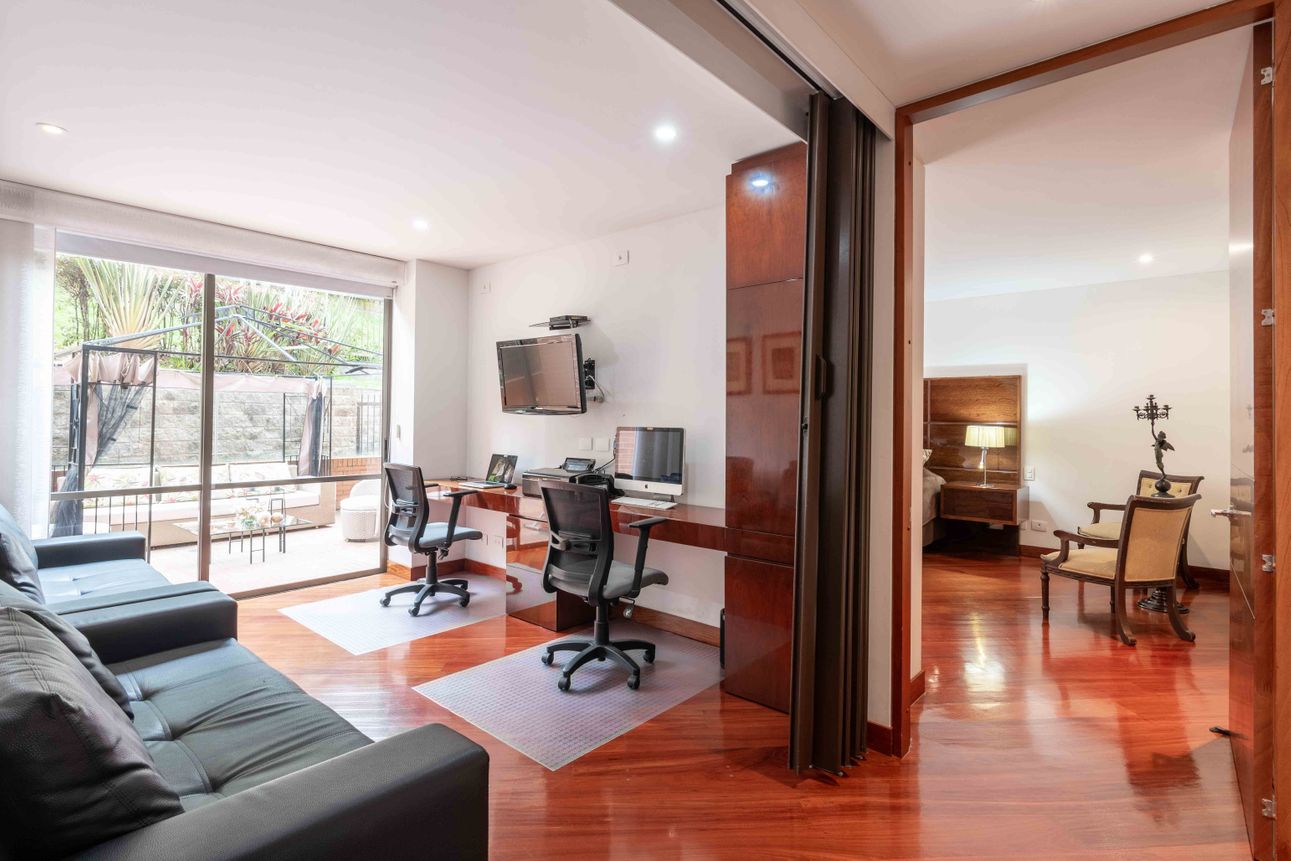 El área privada cuenta con tres habitaciones grandes cada una con baño y un family room o estudio. Uno de los mayores encantos del apartamento reside en sus dos terrazas de 110mts2 a las cuales accedes desde el comedor y el estudio, espacios ideales para reuniones familiares, compartir con amigos y todo con la mejor vista del sector hacia la ciudad y a la naturaleza de los cerros.