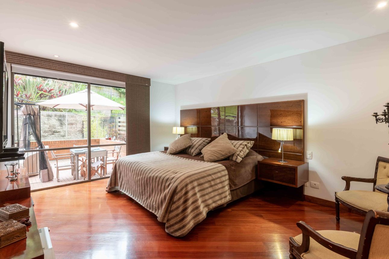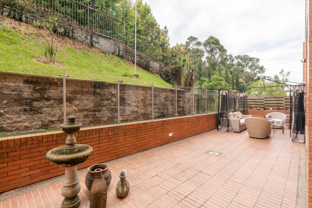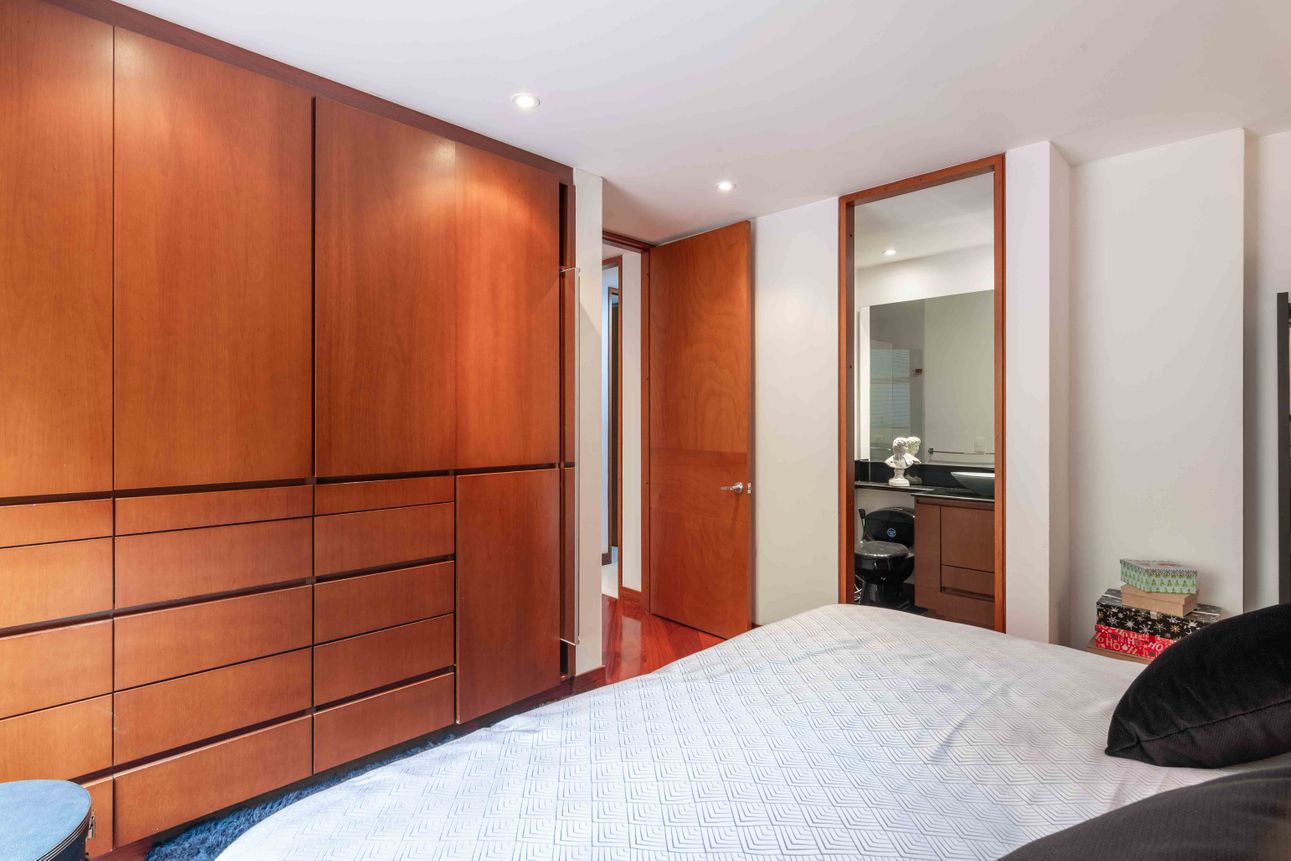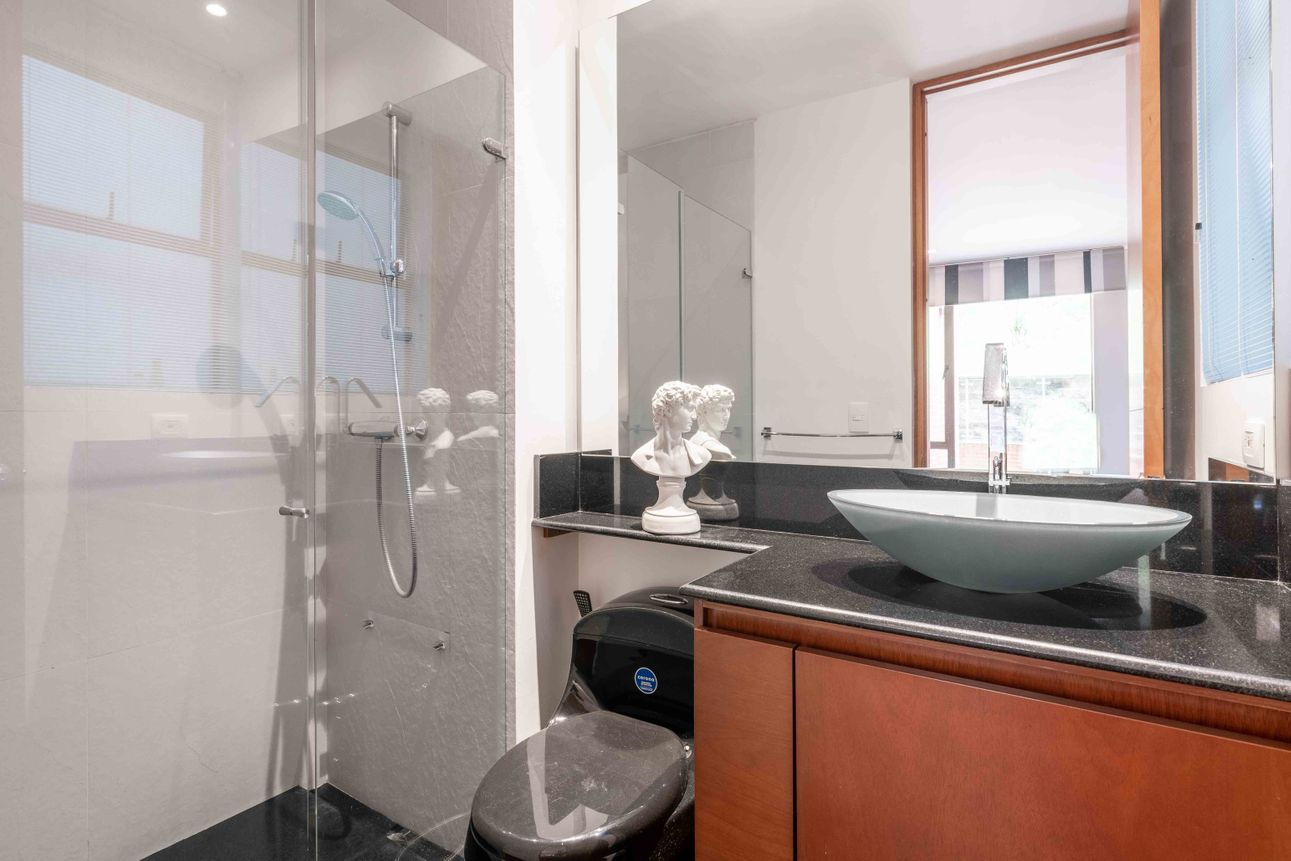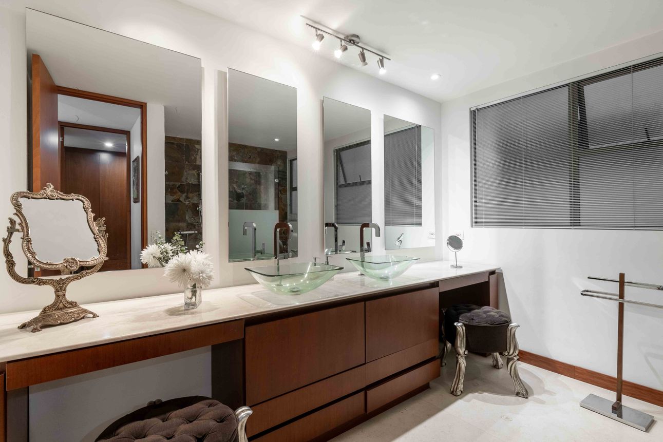 El área privada cuenta con tres habitaciones grandes cada una con baño y un family room o estudio. Uno de los mayores encantos del apartamento reside en sus dos terrazas de 110mts2 a las cuales accedes desde el comedor y el estudio, espacios ideales para reuniones familiares, compartir con amigos y todo con la mejor vista del sector hacia la ciudad y a la naturaleza de los cerros.