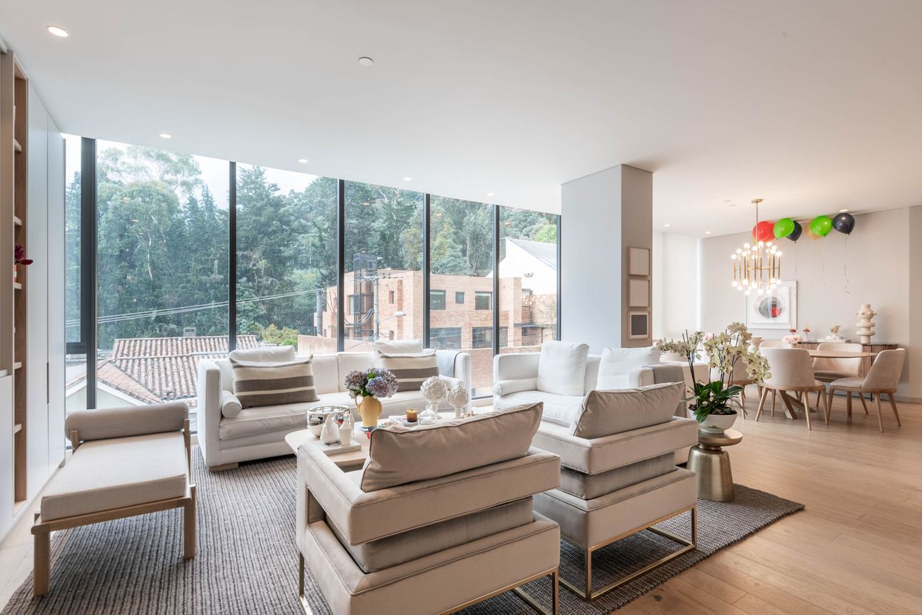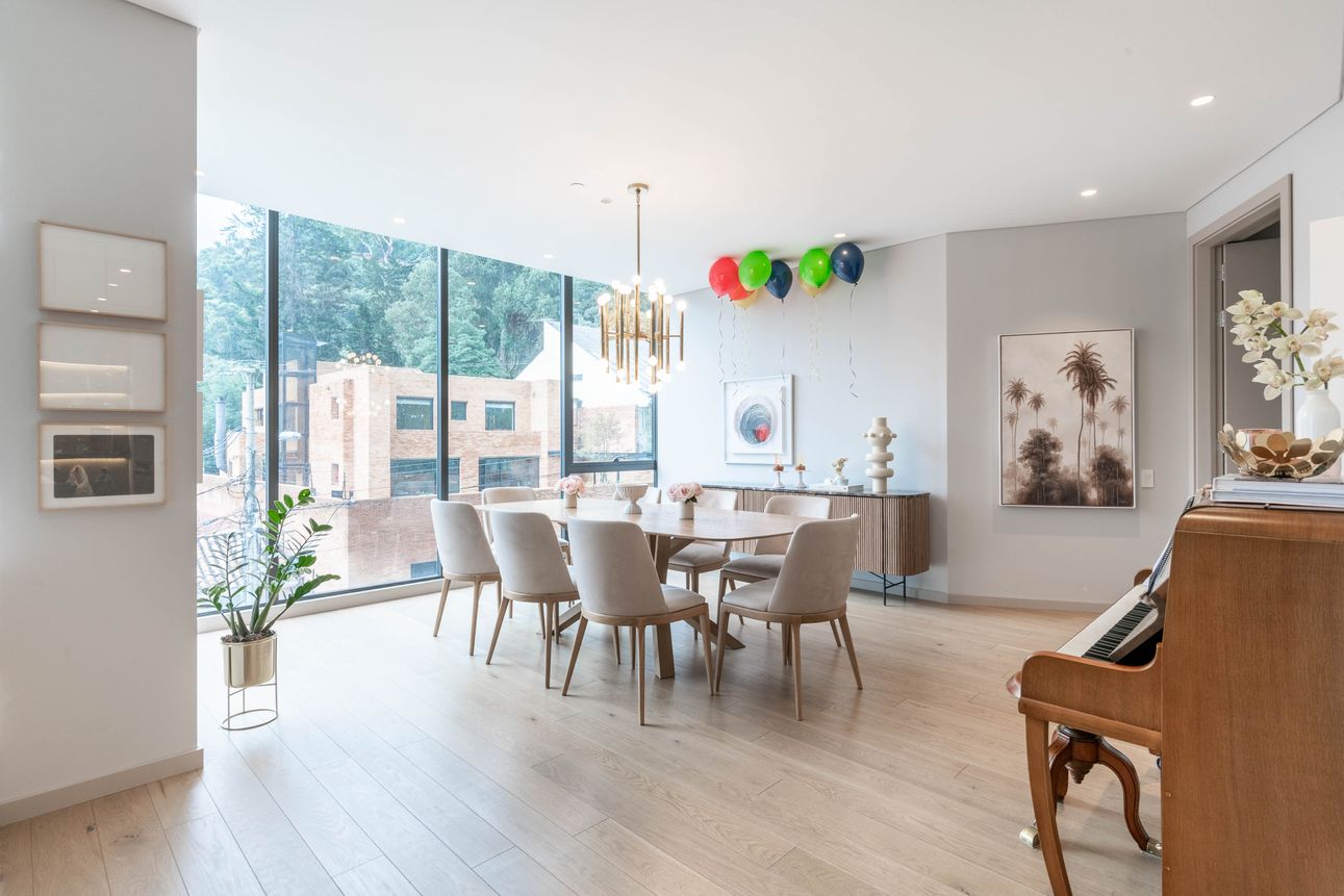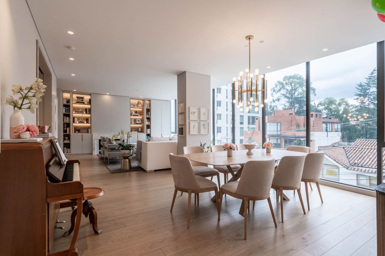 Al ingresar encontramos sala con chimenea y comedor independiente, ambos espacios con ventanales piso a techo que permiten una espectacular vista a los cerros orientales e iluminación natural, baño social. A este ambiente se integra cocina tipo americana con isla.