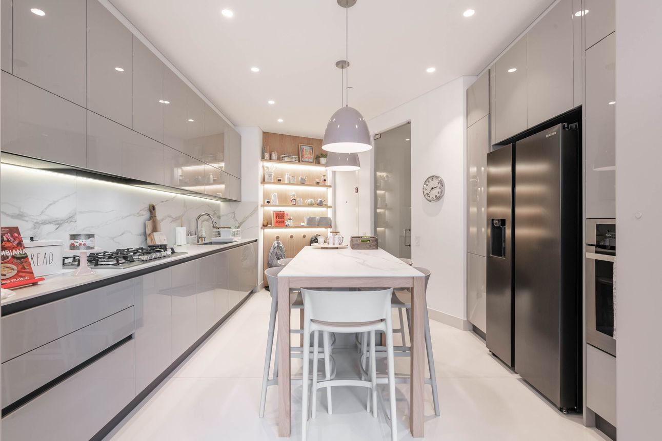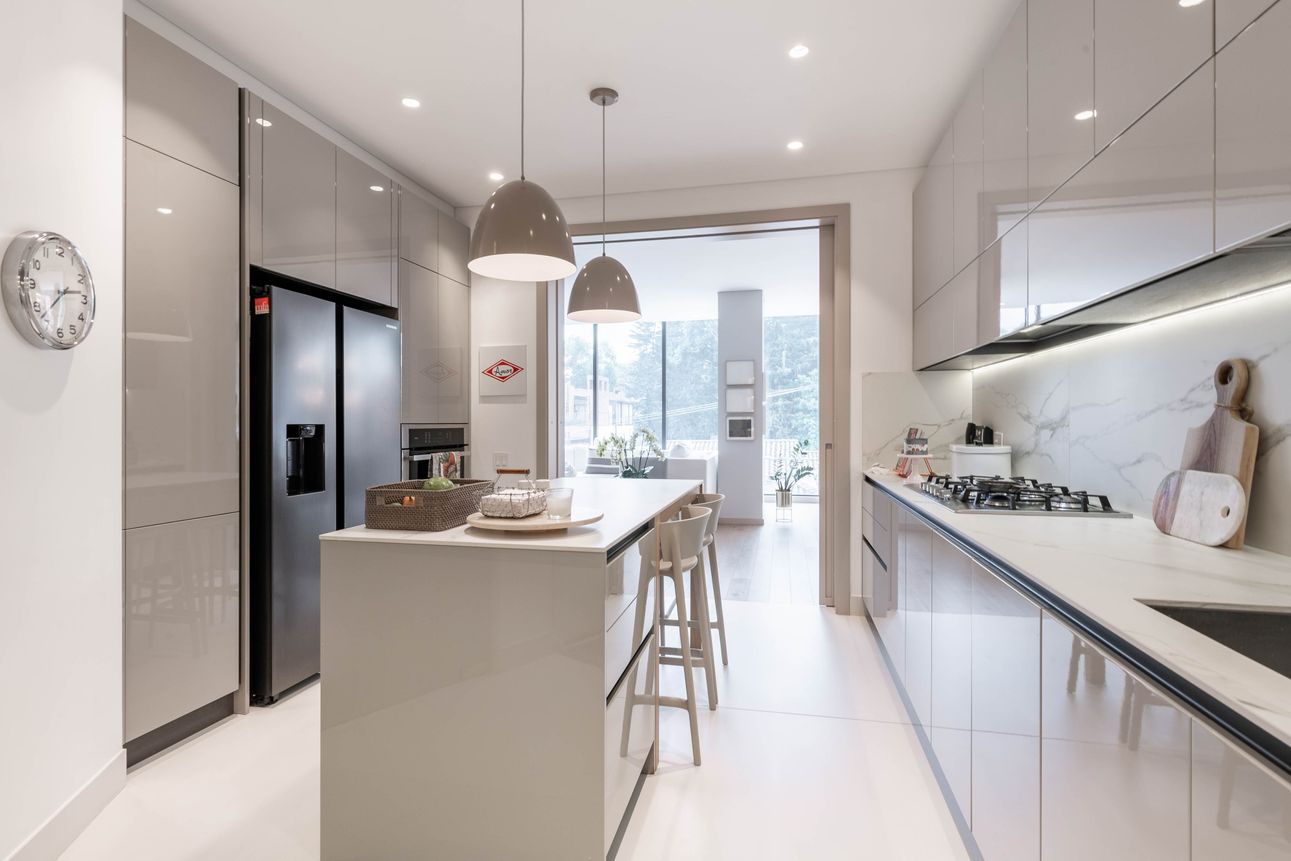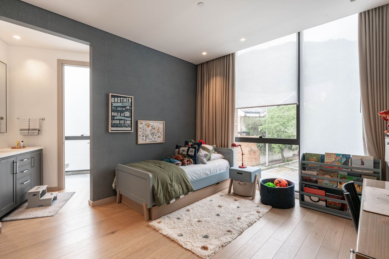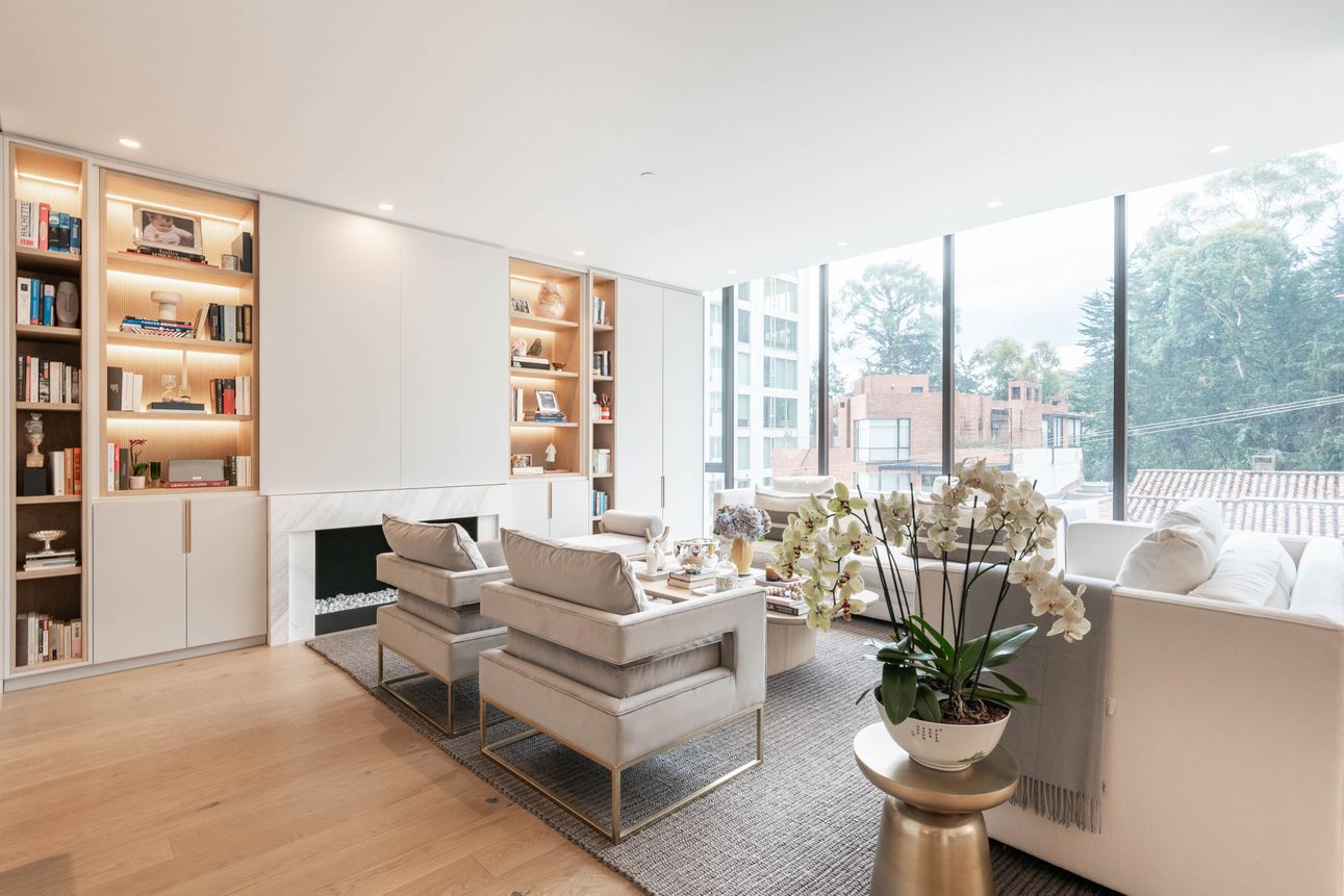 Al ingresar encontramos sala con chimenea y comedor independiente, ambos espacios con ventanales piso a techo que permiten una espectacular vista a los cerros orientales e iluminación natural, baño social. A este ambiente se integra cocina tipo americana con isla.