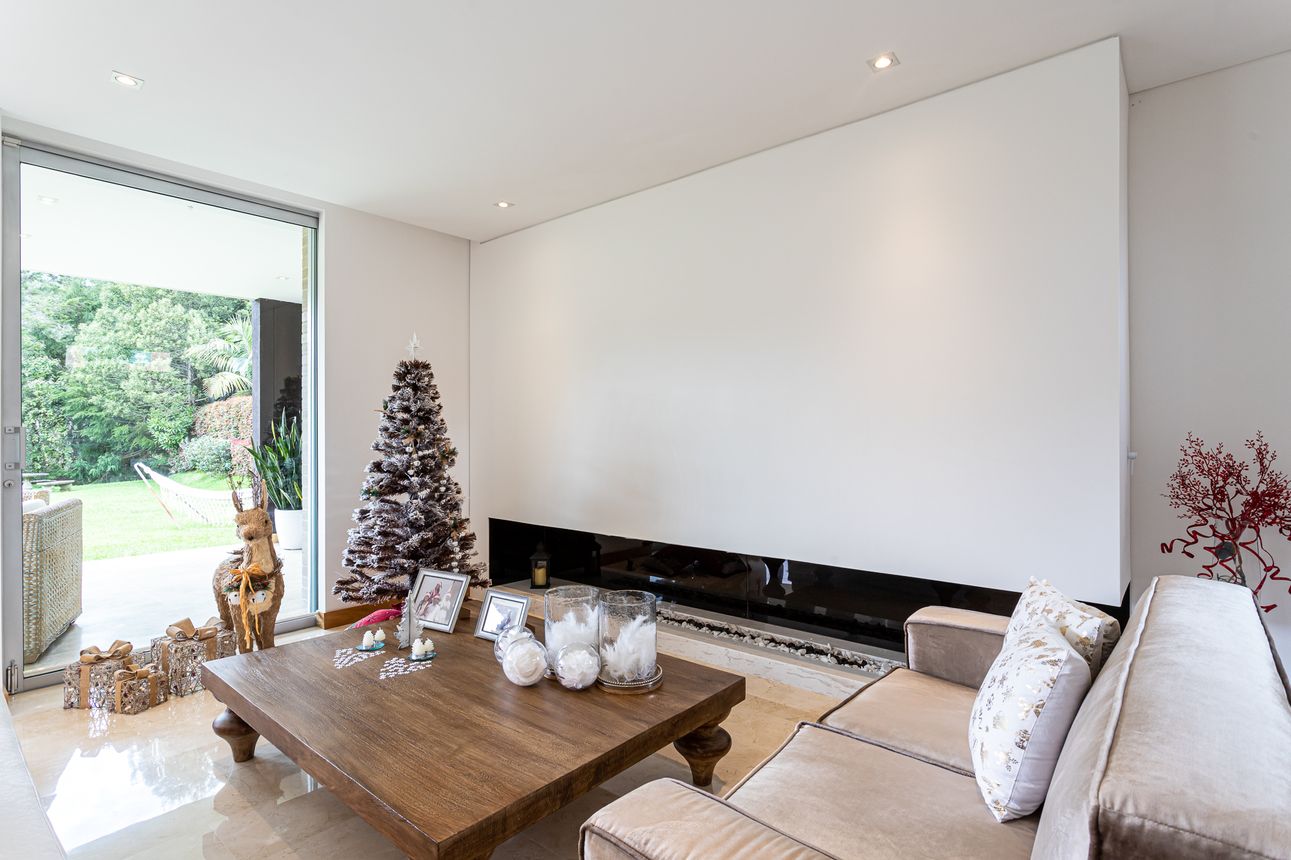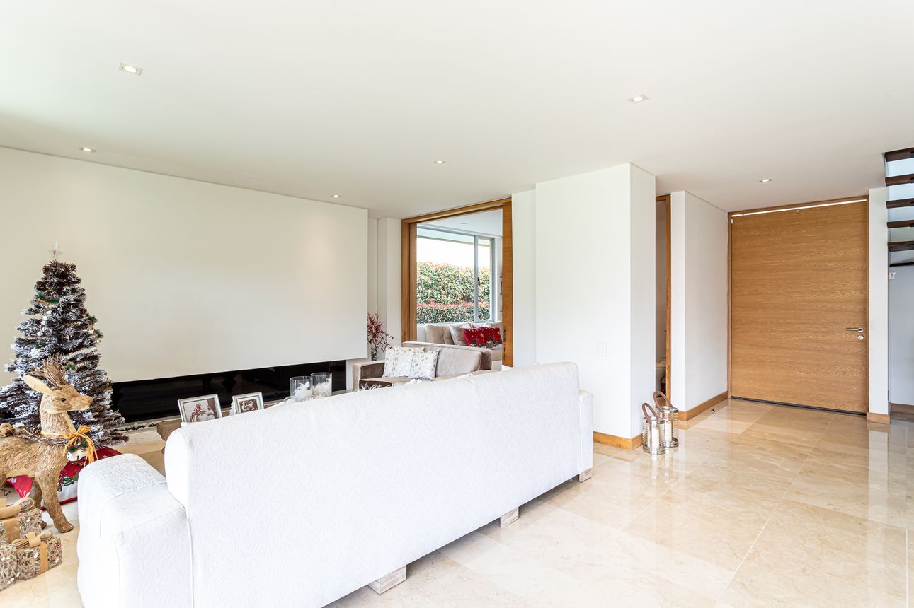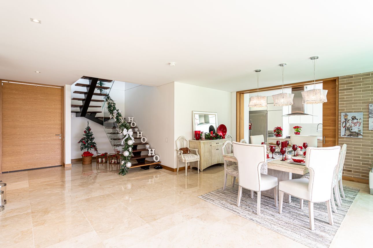 Al ingresar a la casa te encuentras con su amplia zona social, con sala-comedor integrado, acogedora chimenea a gas, estudio independiente, cocina abierta con acabados de alta gama, zona de servicio y lavandería.