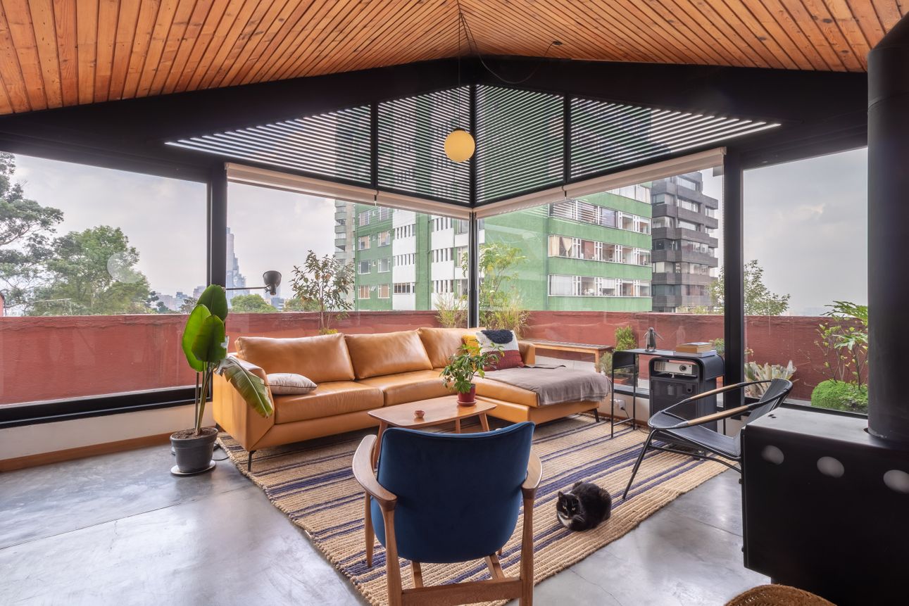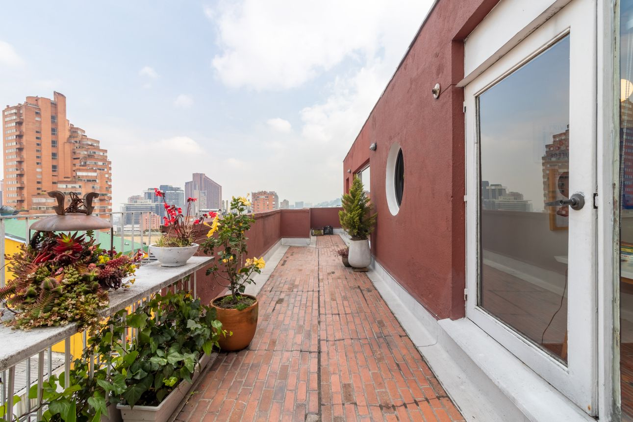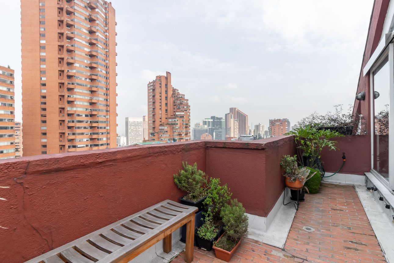 El apartamento cuenta con dos terrazas que rodea el apartamento y una vista espectacular a los cerros orientales (Monserrate) y algunos de los edificios más icónicos de Bogotá.